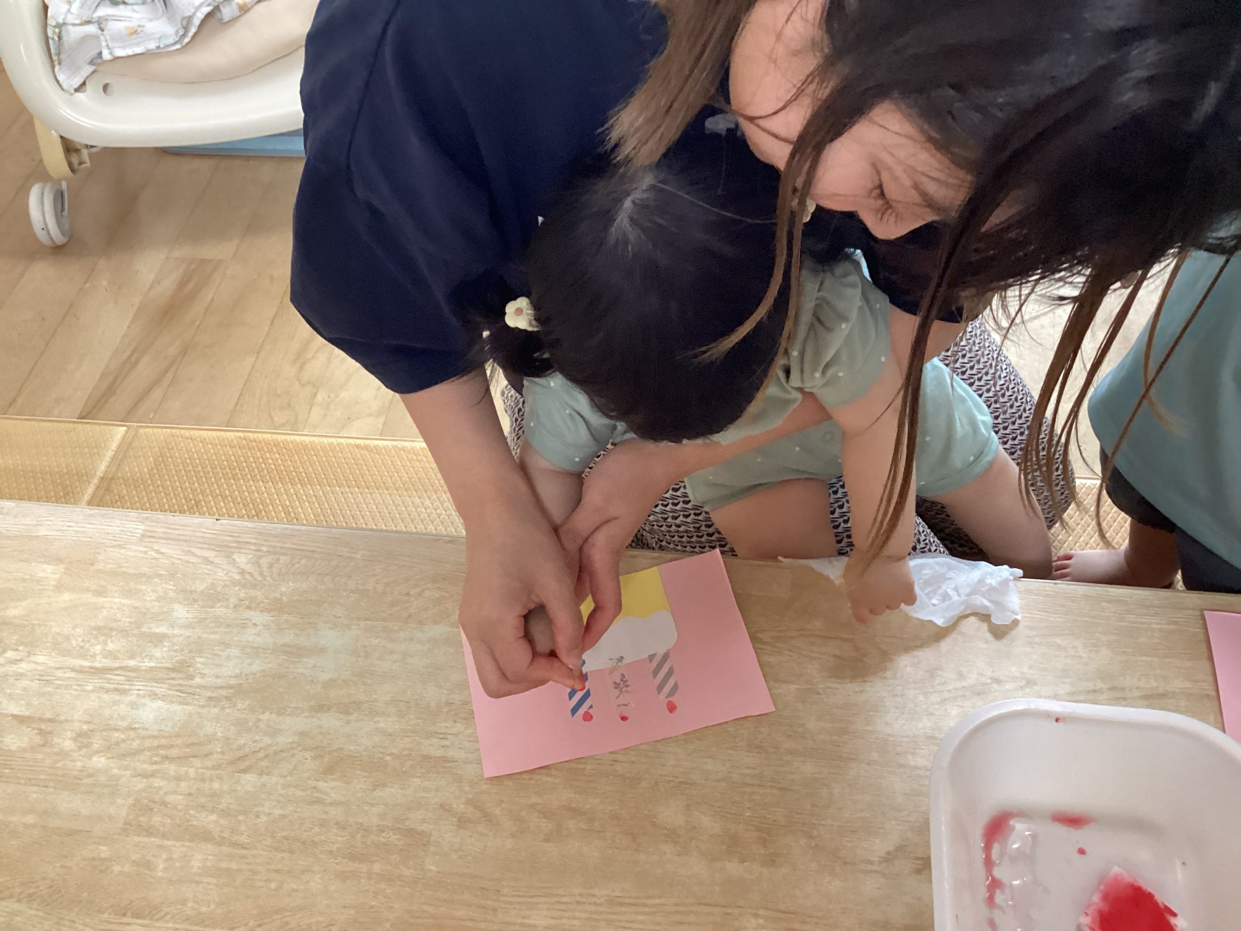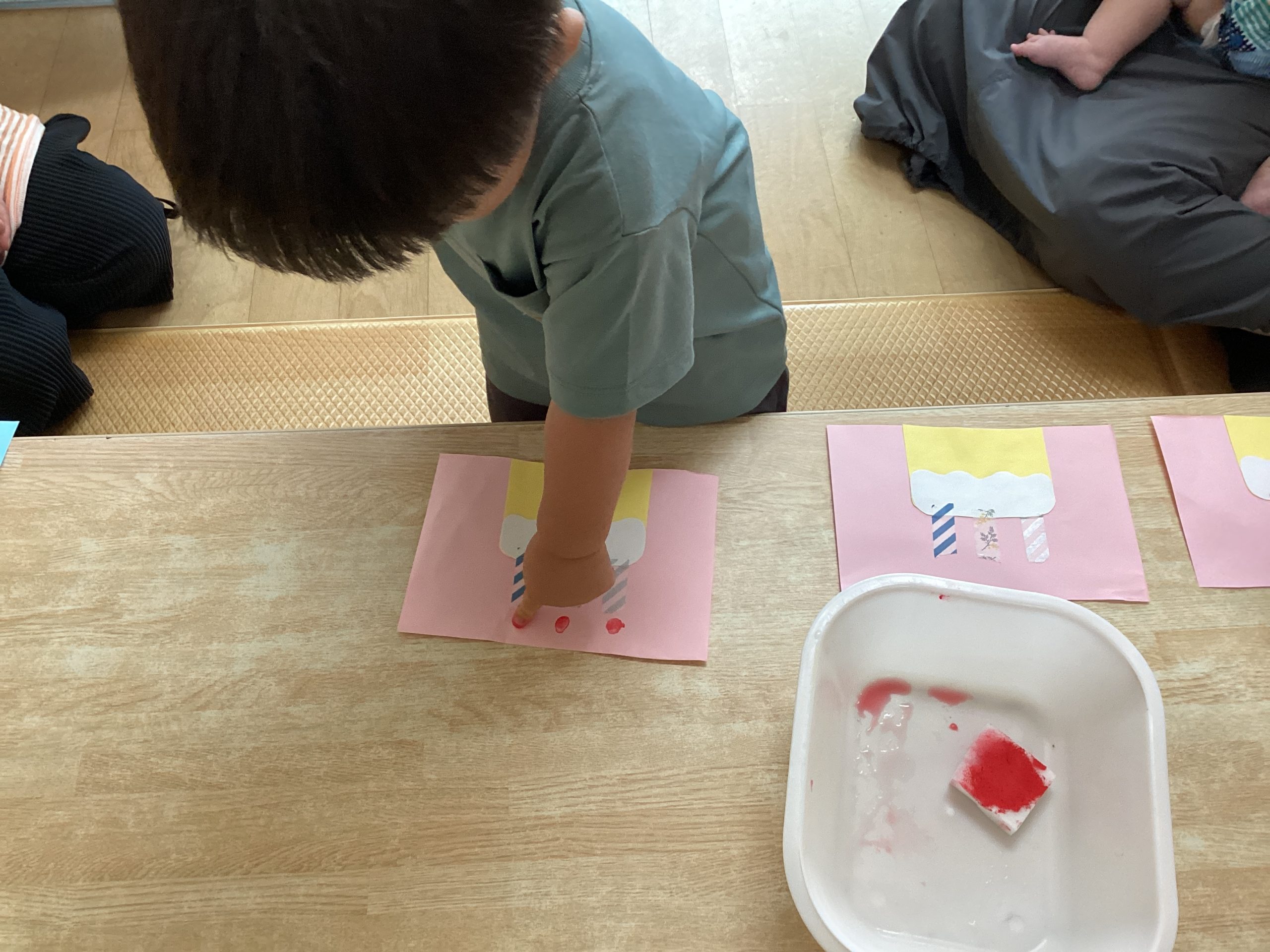 お誕生日ケーキも作りました!ろうそくの火を可愛らしい指でスタンプしましたよ!