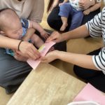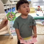 「まあるいたまご」のペープサートをみました。いろいろな模様や大きさのたまごから、「何が生まれるのかなー!?」と興味津々のお友だち!たまごがわれて、ありやへび、かいじゅうなどがでてくると、嬉しそうに触って楽しんでいました!