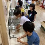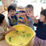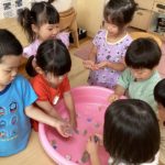 触っていくうちに氷が小さくなってくると「どんどん小さくなってきた」「なんでだろ?」「みんなの手あったかいから溶けてきたんじゃない?」「手にも色付いとる!」と、氷の変化を楽しみながら遊んでいました。