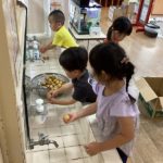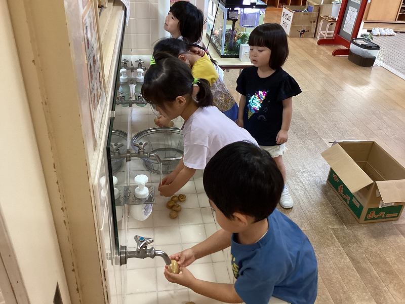 じゃがいもは、以前さんのう農園に掘りに行ったもので「じゃがいも、ちっちゃくて可愛いね」「早く食べた~い」と話しながら嬉しそうに洗う子どもたち。