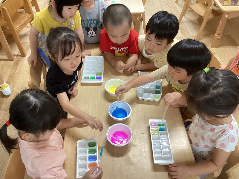 出来上がった色水は冷凍庫に入れ、後日、氷あそびを楽しみたいと思います。