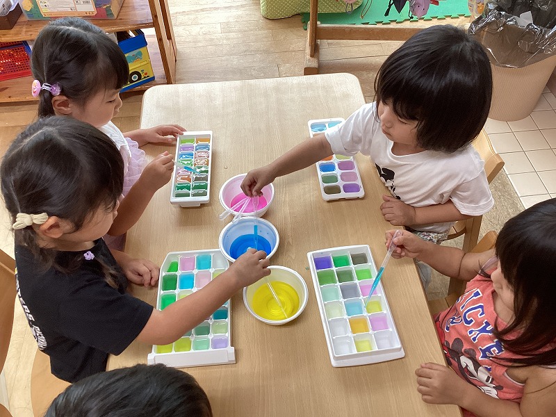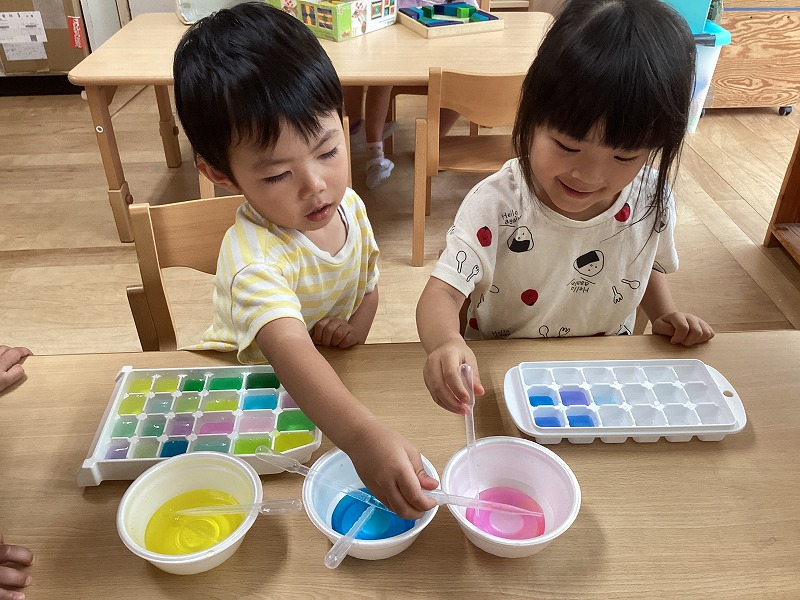 赤・青・黄色の3色を作り、スポイトを使って製氷機の中に色水をたらしていくと、「わぁ!紫になった!!」「こっちはみどり!」「どんどん色が変わっていくね!」と楽しそうに遊ぶ子どもたち。