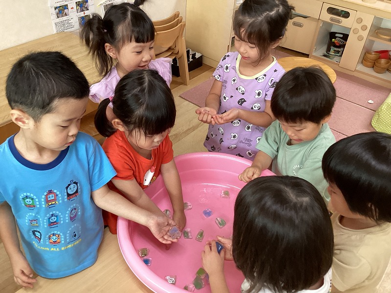 色々な色の氷に「きれい!!」「宝石みたい!」「つめた~い!!」と嬉しそうに触る子どもたち。