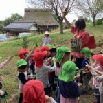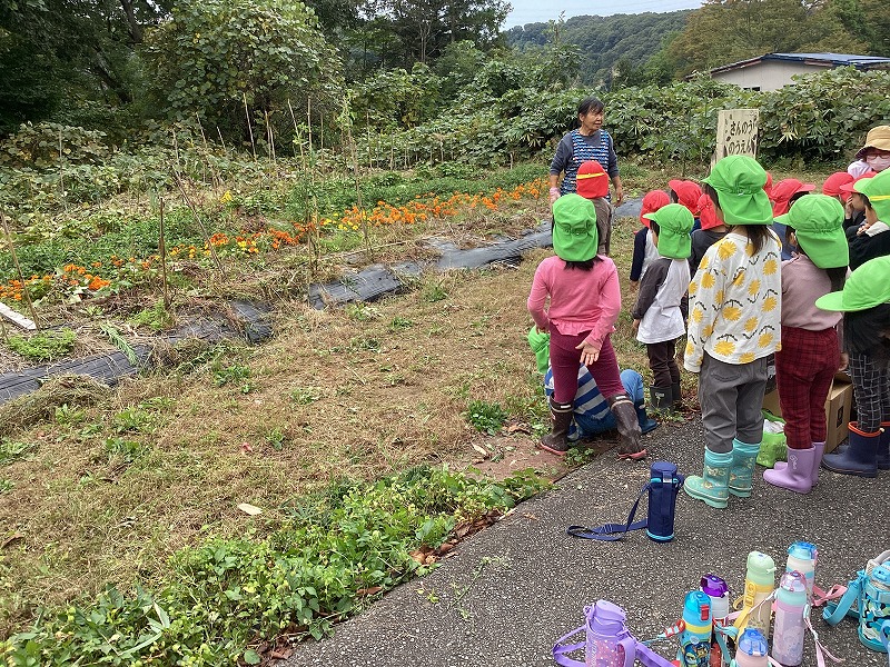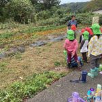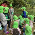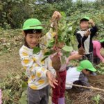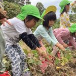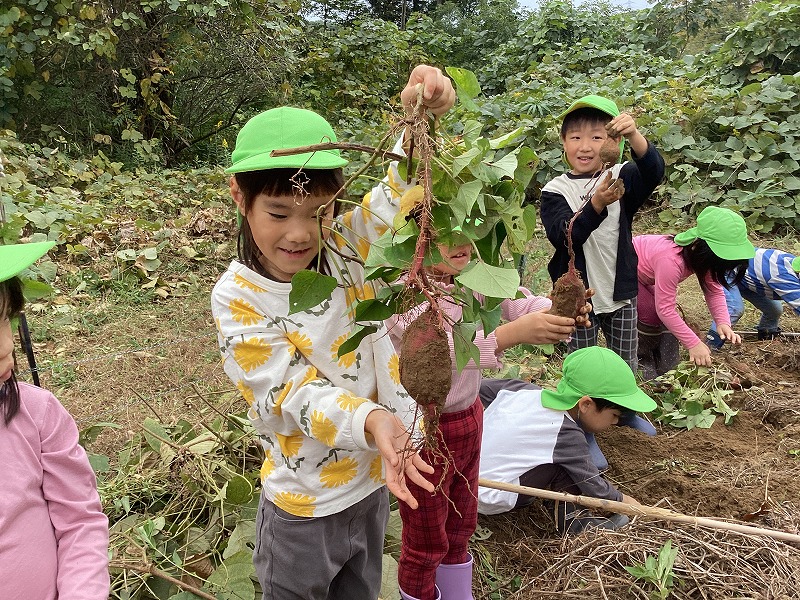 さんのう農園に行き、サツマイモの収穫を行いました。長く伸びたつるをたどりつるを引っ張ると・・・抜けました!!つるごと採れたさつまいもに大喜びでした。土の中のさつまいもを見つけるとさつまいもを傷つけないようにそっと周りから掘りすすめ大きな芋が出てきました。