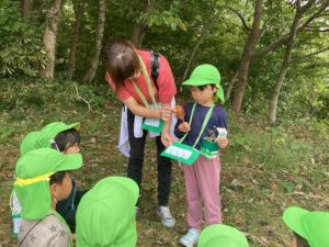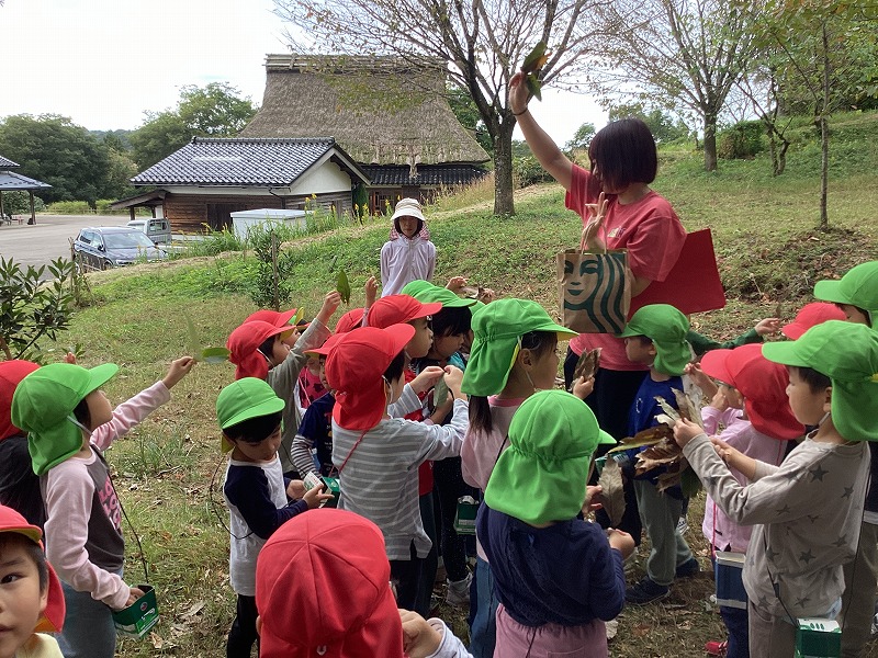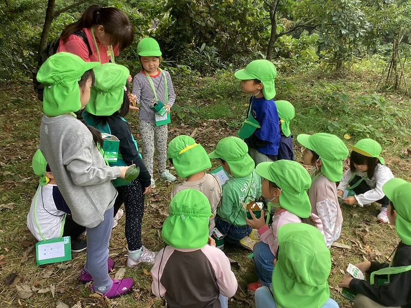 夕日寺自然園へ行き、秋の自然のもと楽しんできました。ちくちくのものやふわふわしたものなど山の中には色んなものがあり、たくさん見つけることも出来ました。実際に山の中に入り、海の見える丘という場所まで頑張ってのぼりました。