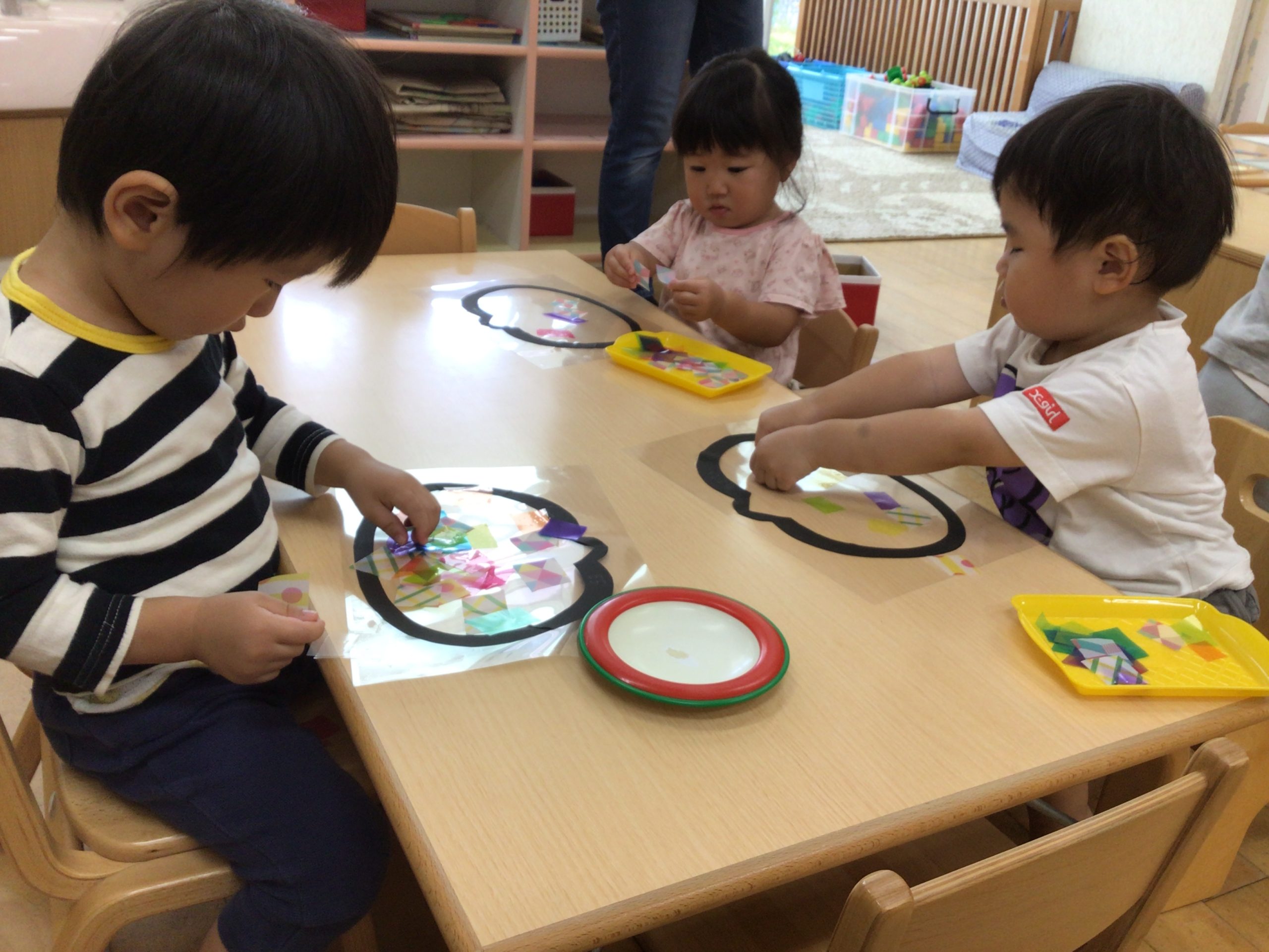 10月に入り、すっかり秋になり、ハロウィン気分の子どもたち。この日はそんな子どもたちと一緒にカボチャのステンドグラスを制作しました!カボチャの形にくりぬいた画用紙に透明のフィルムを貼ってその上にカラフルな画用紙を貼りました!!とっても可愛い個性あふれるカボチャのステンドグラスの完成です💗子どもたちも完成したステンドグラスを見て思わず「かわいい~☺」とつぶやいていました。