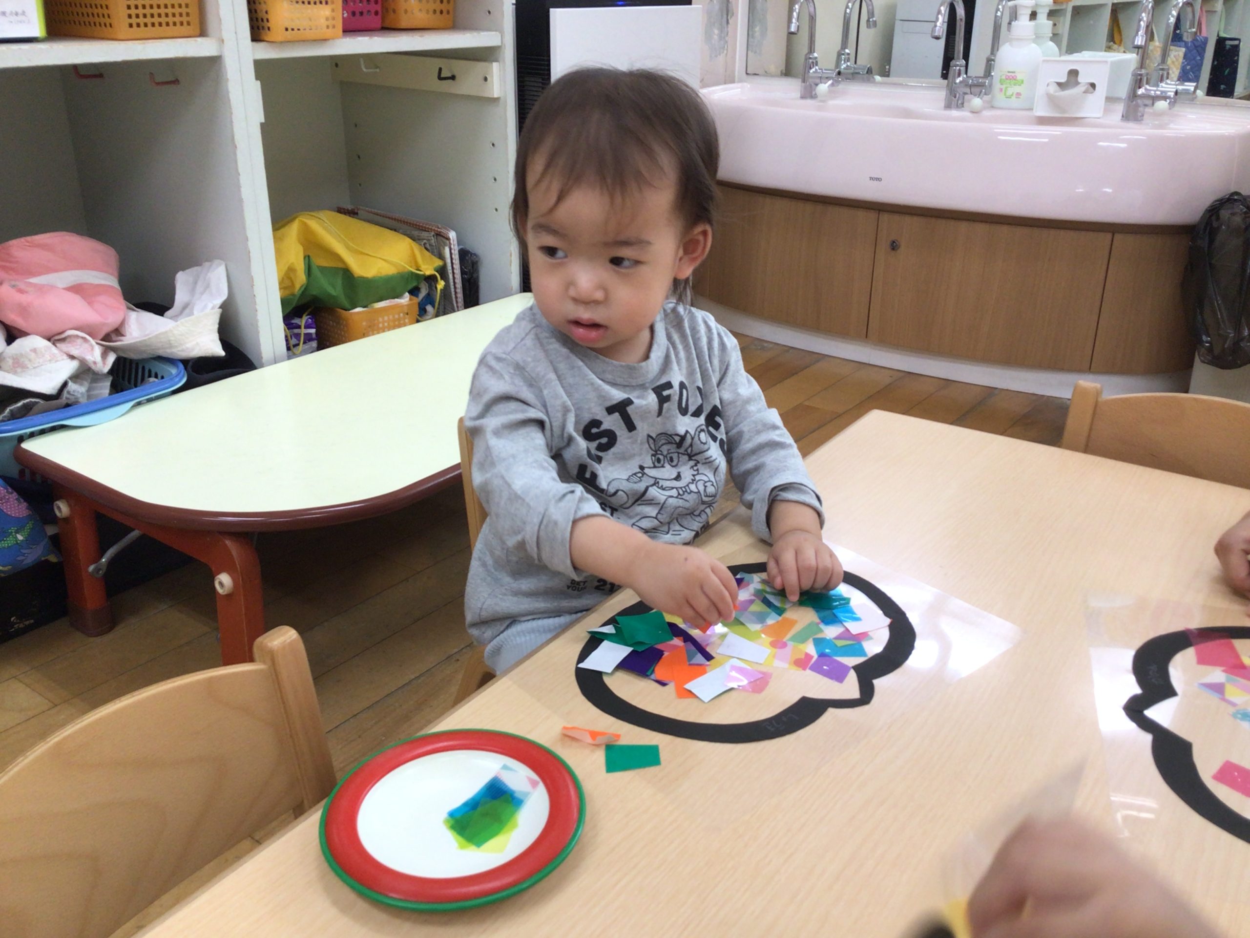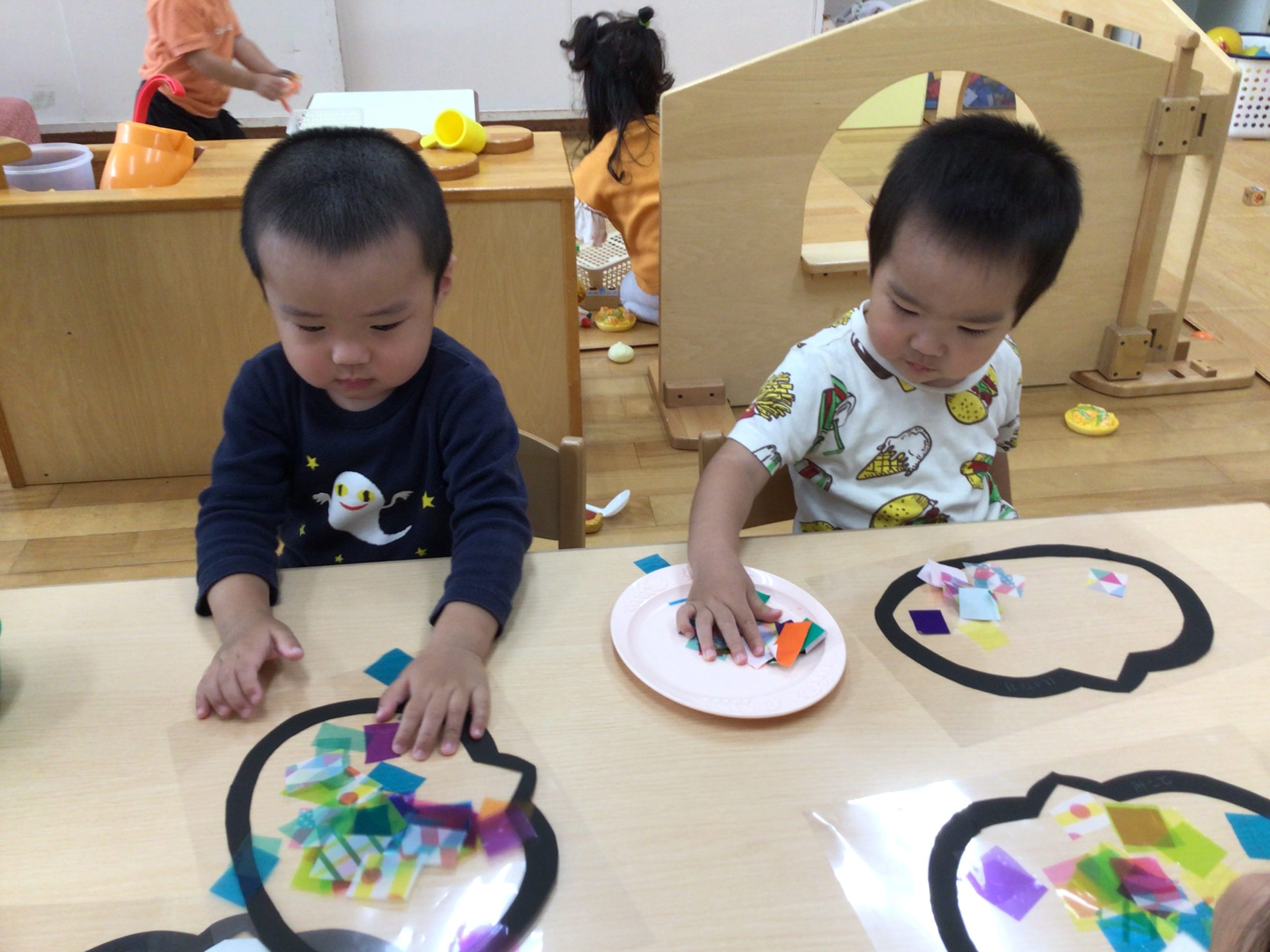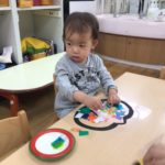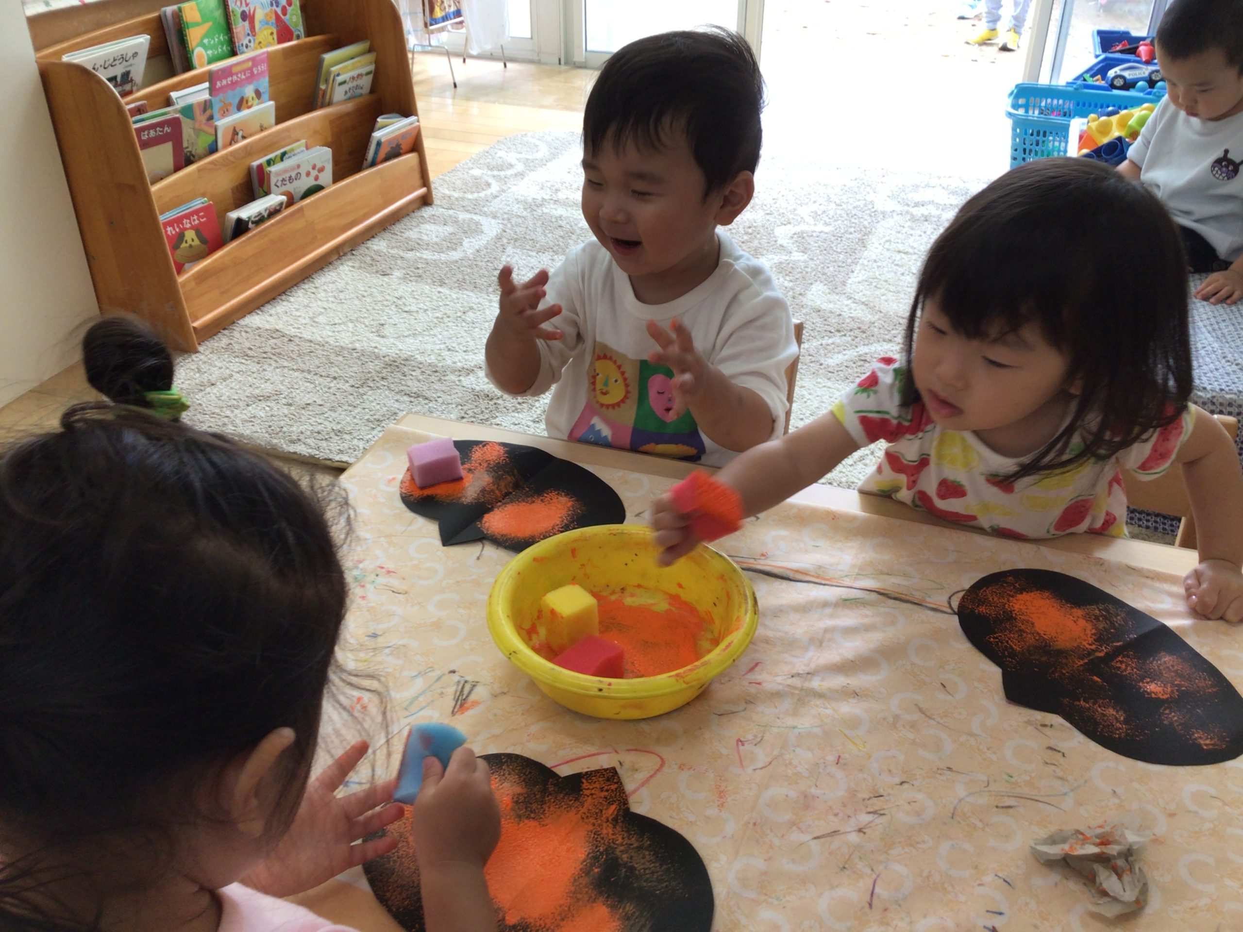 ステンドグラスを作った際にできたカボチャの画用紙に、スポンジを使ってスタンプしました!ポンポンとスタンプすると、みるみるオレンジになっていく画用紙に、「おーー!」と興奮していました。スタンプが楽しかったようで、何度も何度もポンポンしていました。さらに気分が上がった子どもたちです!