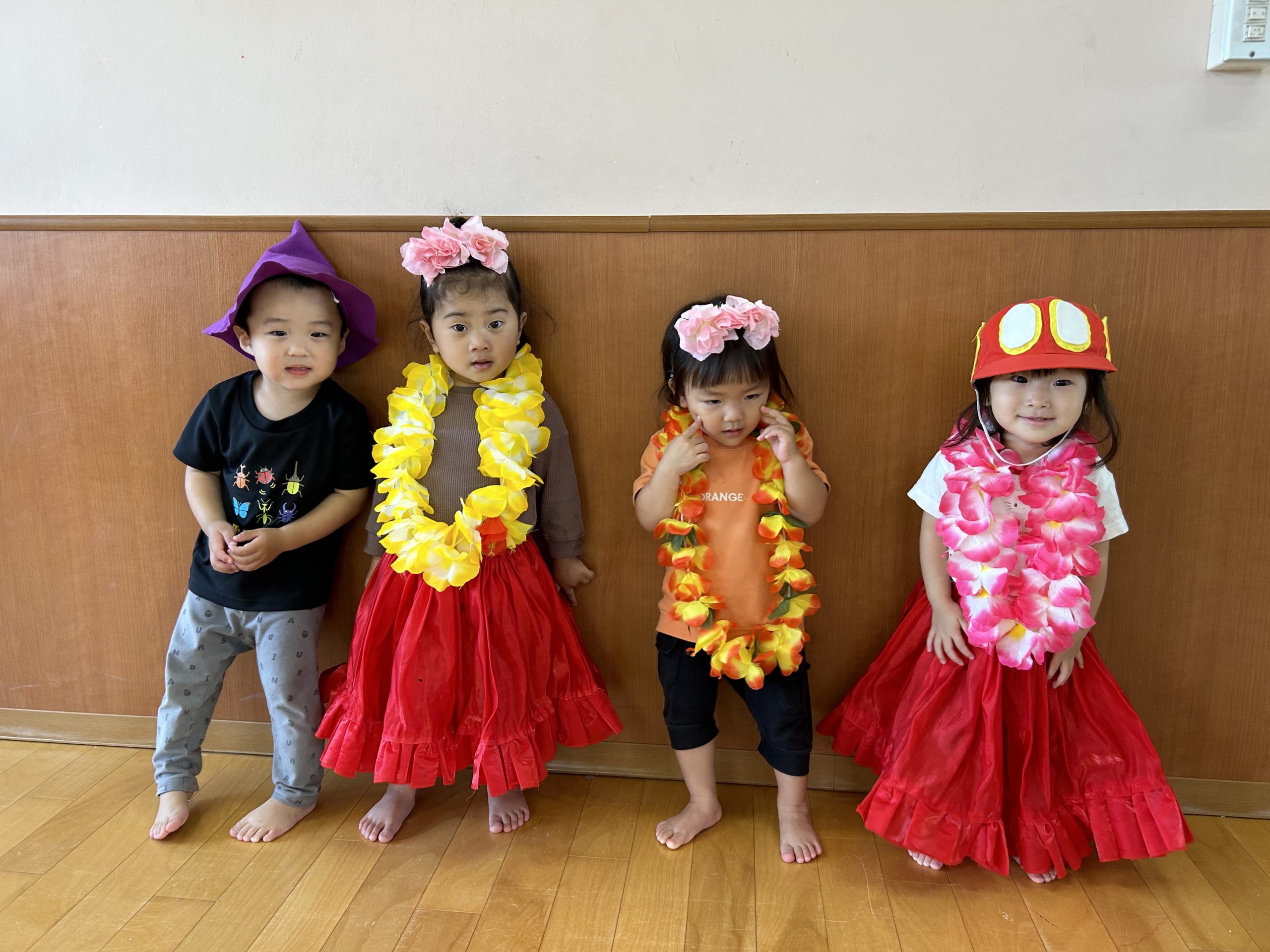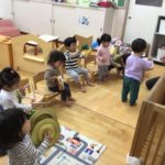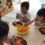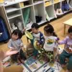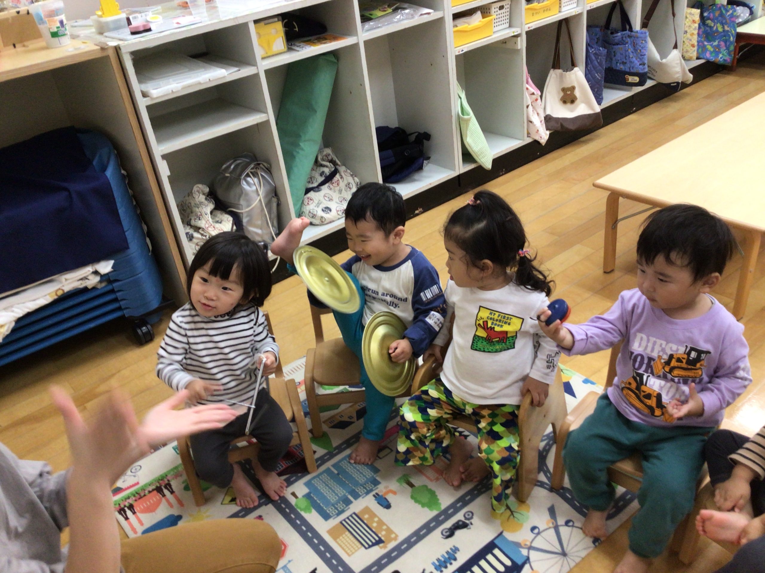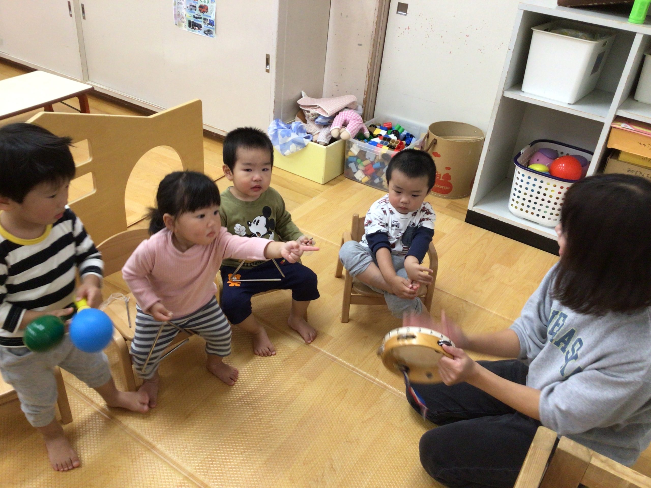“やまのおんがくか”のパネルシアターを見た後、子どもたちも色々な楽器に触れてみました♪叩いたり、振ったりすると音が鳴る様子にニコニコが止まらない子どもたち。カスタネットや、タンバリン、トライアングルで素敵な音色がお部屋中に響き渡っていました。次の日も「やりたい!」と楽器遊びのブームはしばらく続きそうです!!