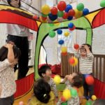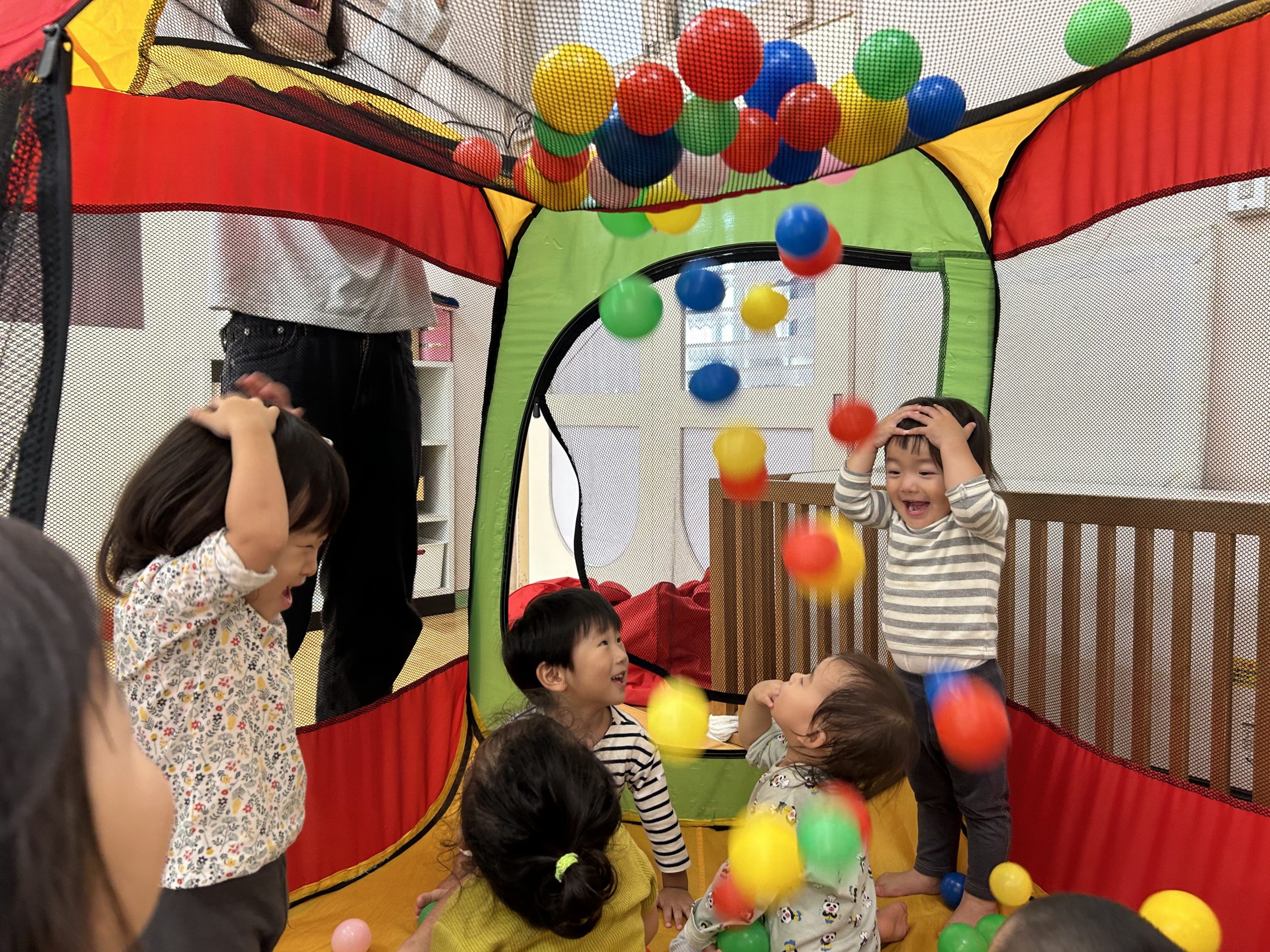 お部屋にボールハウスを出すとすぐに気づき、嬉しそうに駆け寄ってきて遊んでいます!特に子どもたちが大好きなのは、ハウスの上の穴からたくさんのボールが落ちてくる瞬間!必死にボールをかごの中に集めて保育者に「ジャーってして!!」と頼んでいます。お楽しみの準備は自分たちでしています(笑)ボールハウスの中で遊んでいることで、ボールを投げたり、キャッチしたりする力も身に付いています!