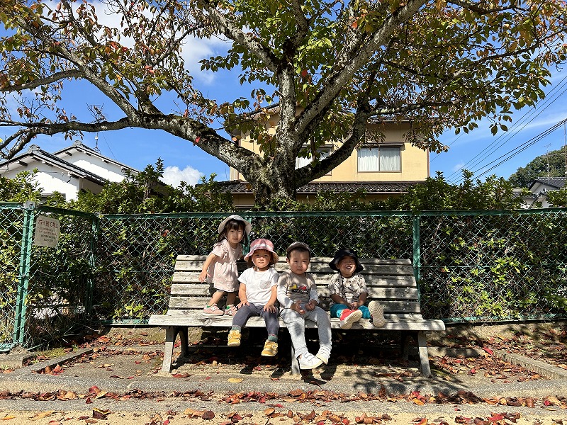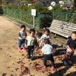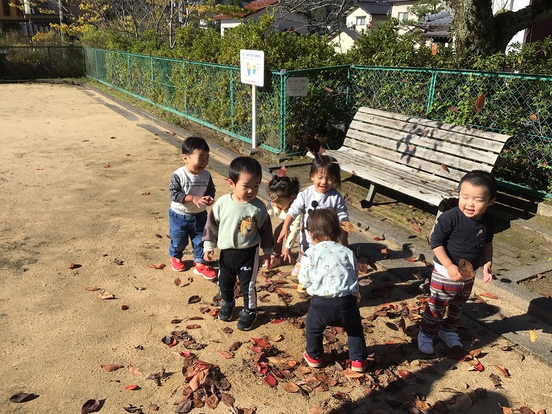 晴れている日は自然と子どもたちから、「今日もお外行きたい!」という声が上がります。毎日外に出て遊んでいると、葉っぱの色が変わっていったり、地面にたくさん落ちていたり、秋は自然の変化が楽しい季節ですね!