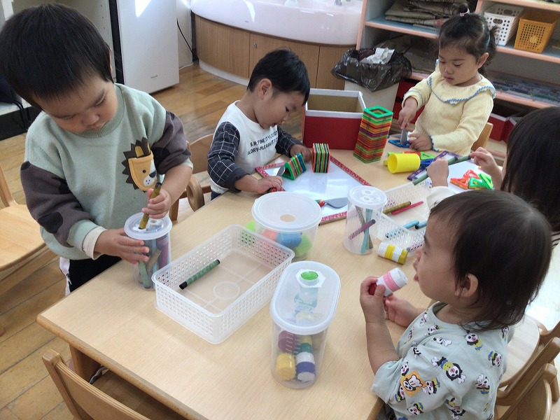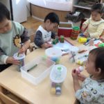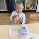 指先を使ったおもちゃで遊ぶことにも興味を持ち、集中して遊ぶようになってきました。最近は、細いスティックやストローを落とすポットん落としや、洗濯ばさみを挟むおもちゃ、小さなスポンジを小さな枠に入れていくおもちゃなども仲間入りし、何度も繰り返し楽しんでいます。