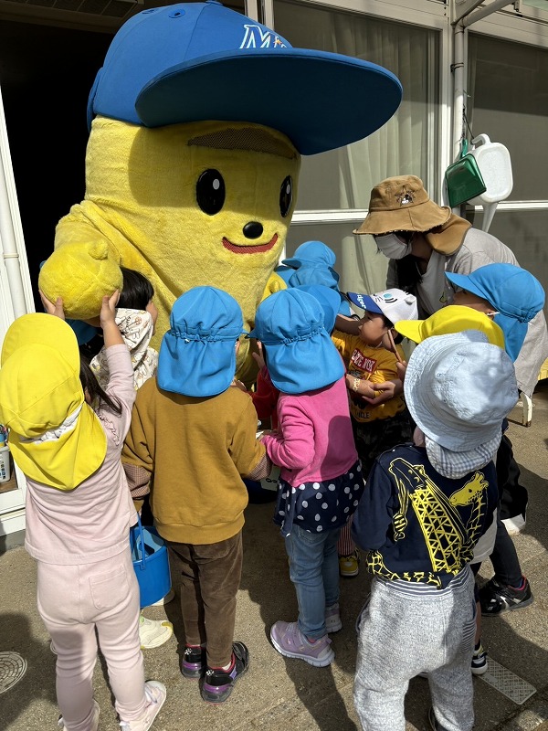 園庭で遊んでいると、星の形をした大きなキャラクターが遊びに来てくれました。子どもたちは、ビックリして固まっていましたが、保育者と一緒にご挨拶に行ってみると、緊張した面持ちでタッチをしていました。