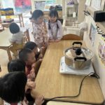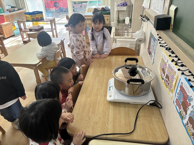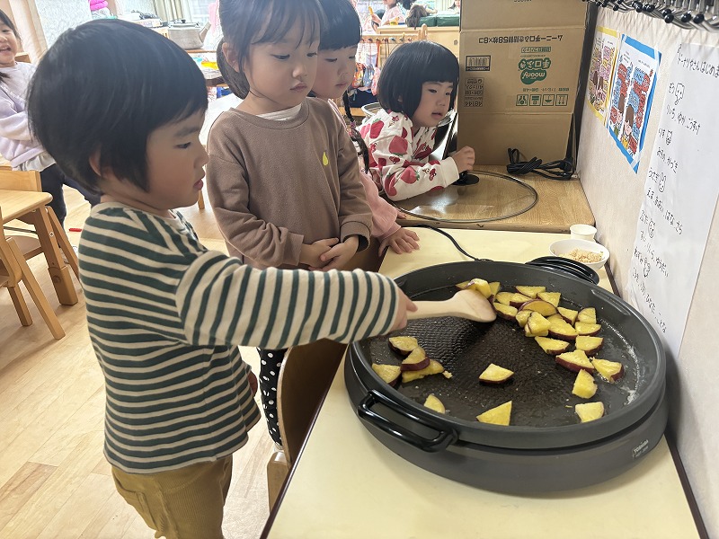 さつまいもをゆででいると「なんかいいにおいしてきた!」「(さつまいもの)色もだんだん黄色になってきたよ!」と興味津々な子どもたち。