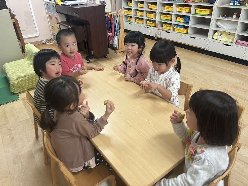 普段から粘土でもよく遊んでいる子どもたち。さつまいもも上手に丸め、ごまをつけていました。