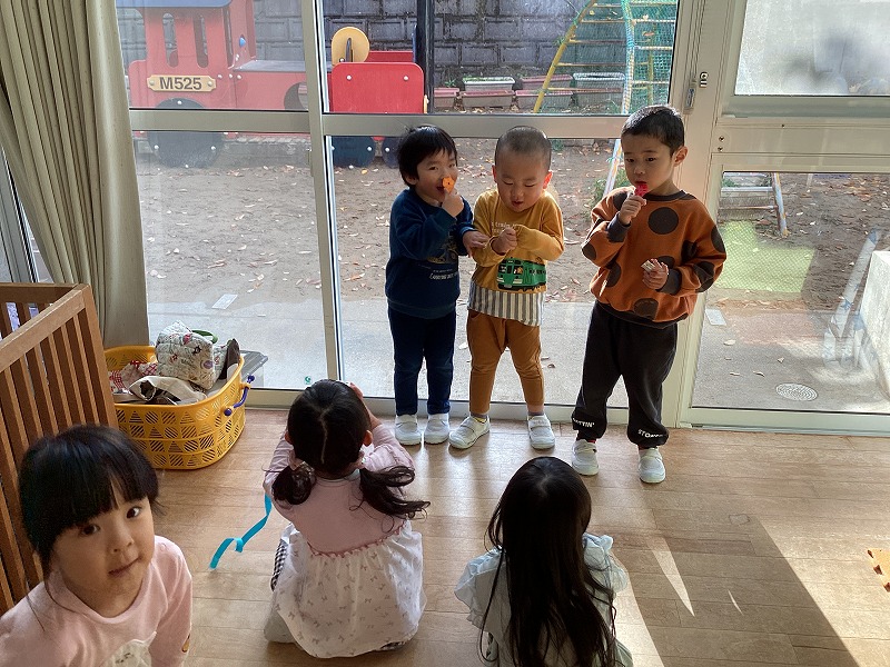 部屋中にバターの香りが広がると「いいにおい!」「はやくできんかな~」と完成を心待ちにしていました。