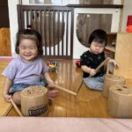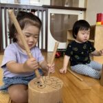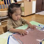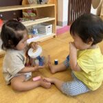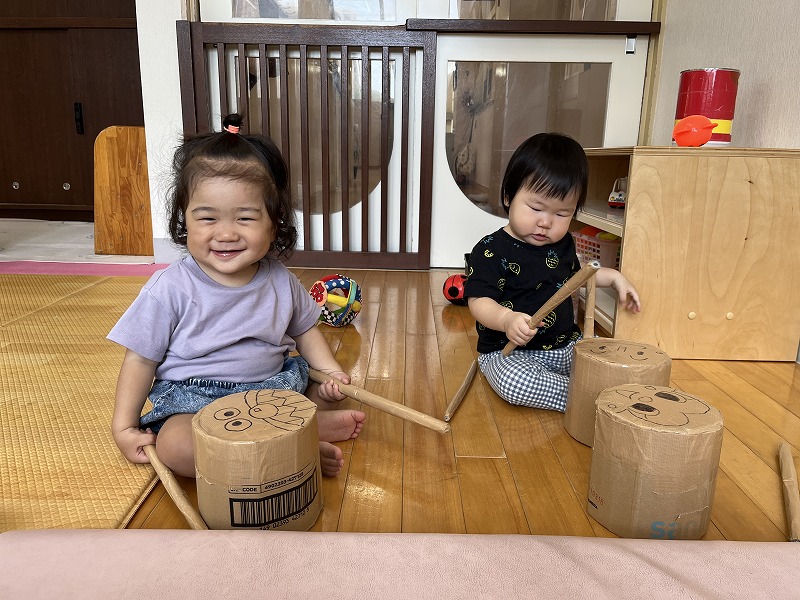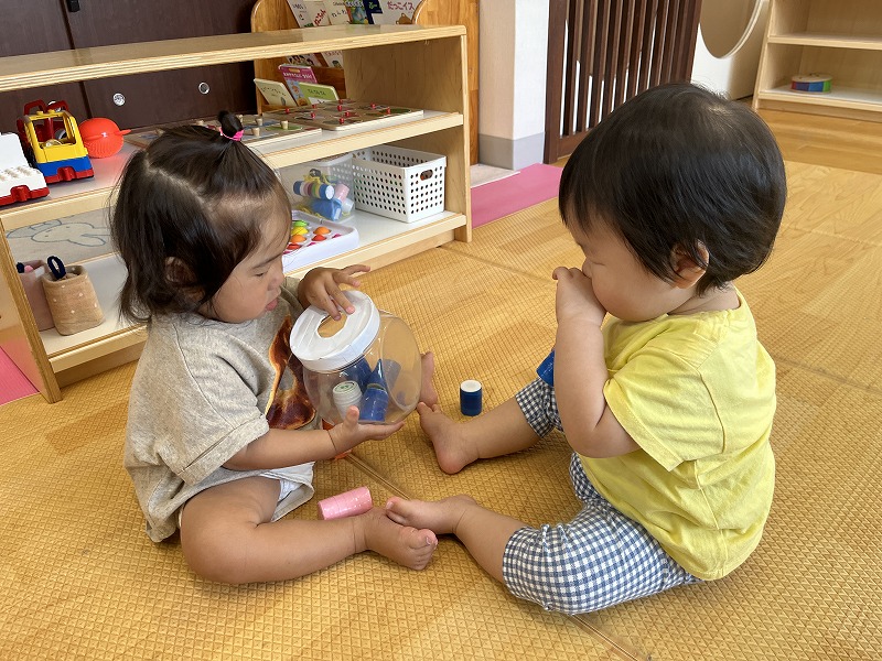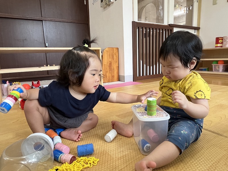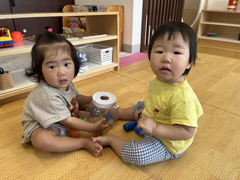 お友だちやお友だちのしている事に興味を持って遊ぶ姿が見られ、顔を見合わせていないいないばあをしてニコニコ遊ぶ様子も見られ、とっても微笑ましいです!保育者が仲立ちとなりながら、お友だちと遊ぶ楽しさをたくさん味わっていきたいです。