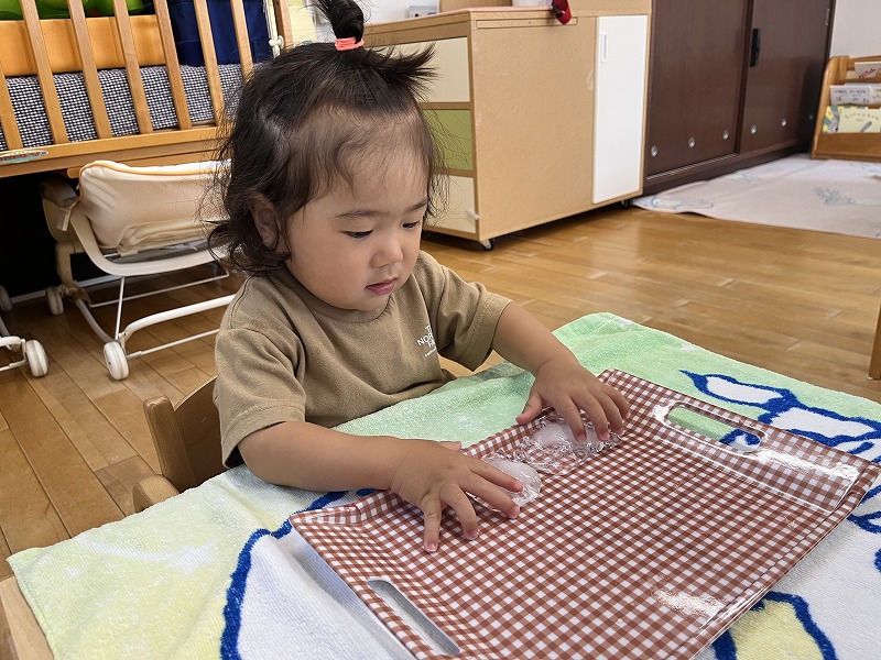 毎日暑い日が続いており、たらいに水を入れて水あそびをしたり、氷に触って遊んだりと、涼を感じられるような遊びを楽しんでいます!氷遊びでは氷に触っては“つめたーい”と保育者の顔を嬉しそうな顔で見ながら濡れた両手をパチパチ叩いたり、氷がつるつると滑ってなかなかつかめない様子に“あれ?”と不思議そうな顔をしたりと、表情をクルクルと変えながら見せてくれる子どもたちの反応がとっても可愛らしいです。
