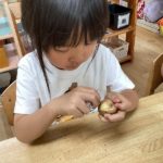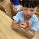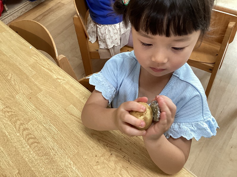 「ほんとに(アルミホイルで)むけるん?」と最初は半信半疑の子どもたちでしたが、ゴシゴシしていくうちに「あっ!白いところみえてきた!!」「ほんとにむけるんや!!」と嬉しそうに皮をむく子どもたちでした。