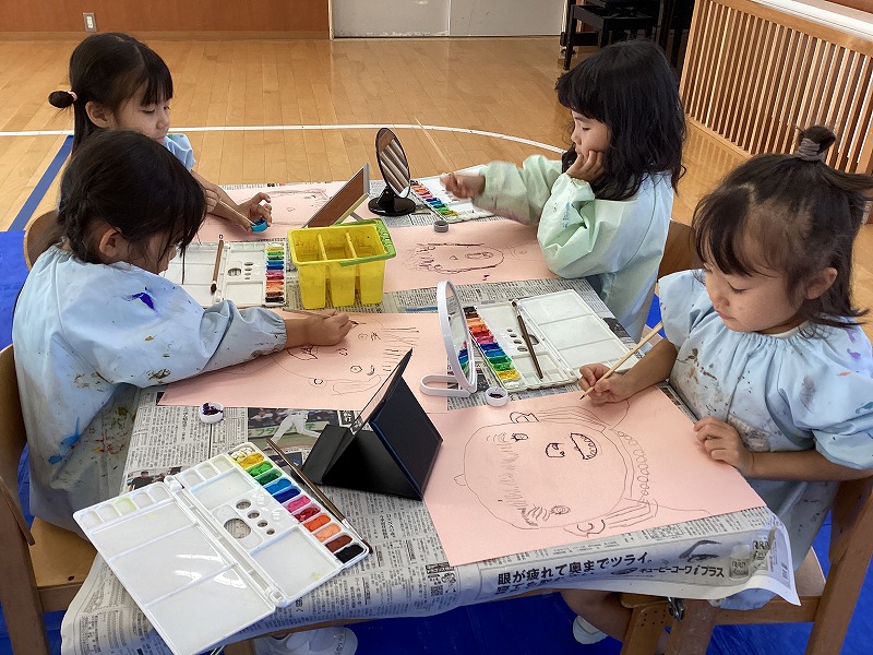 「自分の肌は、目はどんな色だろう?」と、鏡と絵の具の色を見比べながら「もっと茶色入れようかな?」「こんな色かも!!」と色を混ぜ合わせ自分の色を作っていました。