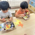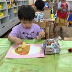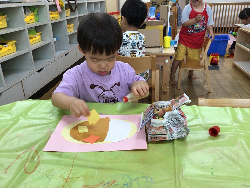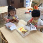 ハサミで画用紙を切って具材に見立て子どもたちの大好きなカレーを作りました。ハサミで切っている時から「これにんじん?」「これおにく⁈」とつぶやきながらワクワクしていました。実際にトッピングし、具材たっぷりの個性豊かで美味しそうなカレーが出来上がりました!!「カレーできましたよ~!」「たべてくださーい!」とごっこ遊びも盛り上がりました!少しづつ直線切りなどにも取り組んでいきたいです!