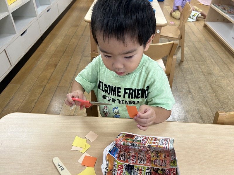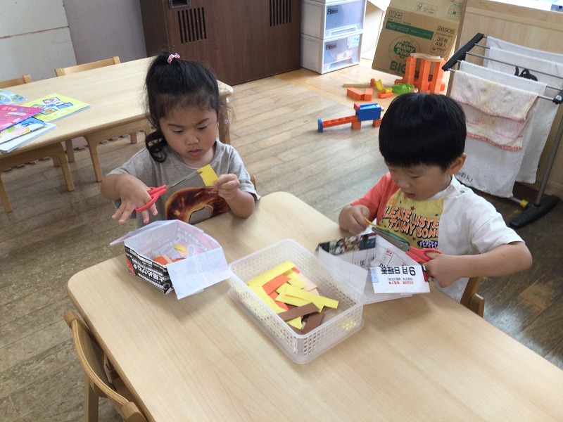 保育者がハサミを使っているといつも興味津々で見ていた子どもたち。実際にハサミにチャレンジしました。始めは持ち方もわからず見ている保育者はヒヤヒヤしていましたが、子どものやる気はものすごく「まだやる!!」と何十分も取り組んでいました。数日間ブームが続き「今日もはさみしたい!」と話してた子どもたちです。徐々に持ち方、切り方を覚え1回切りはスムーズになってきました!