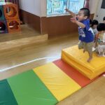 体を動かすことが大好きな子どもたち。雨の日はホールで思いきり体を動かしています。何をしたいのか聞くと「じゃんぷしたい!」と答えていたのでマットを出してジャンプ台を作りました。カラフルなマットなので「みどりまでいきたい!」と目標を持ち、「せーのっ」と言いながらジャンプしています。日に日に距離も伸び成長を感じています!