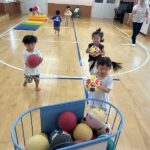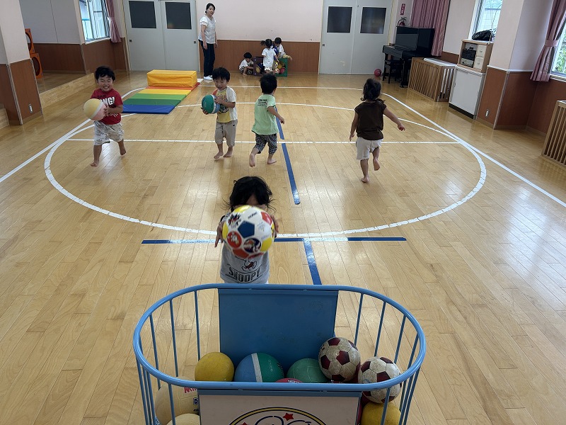 “ボール運び”などのゲームを楽しみながらも体を動かしています。ただ走るだけではなく、ボールを運んでカゴに入れて戻ってくるというルールを追加するだけで少し難易度があがります。早くいかなきゃ!と思っていてもボールが上手くカゴに入らなかったり、ボールを持っていると走りずらくなり走るのが遅くなったり…。それでも子どもたちは嬉しそうにボールを運んでいました!これからも楽しみながらルールのある遊びを楽しんでいきたいです。