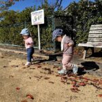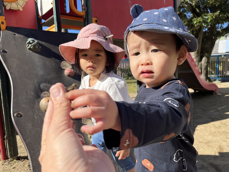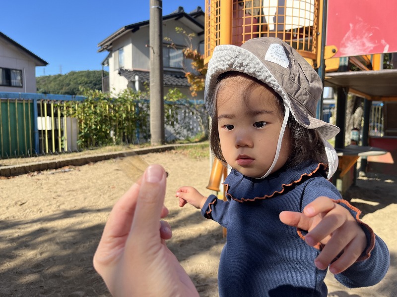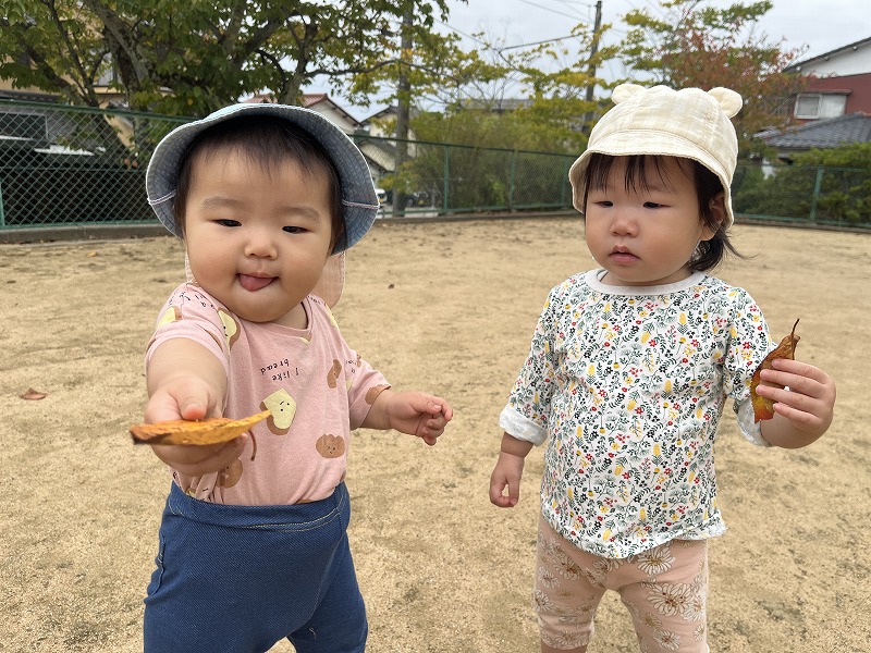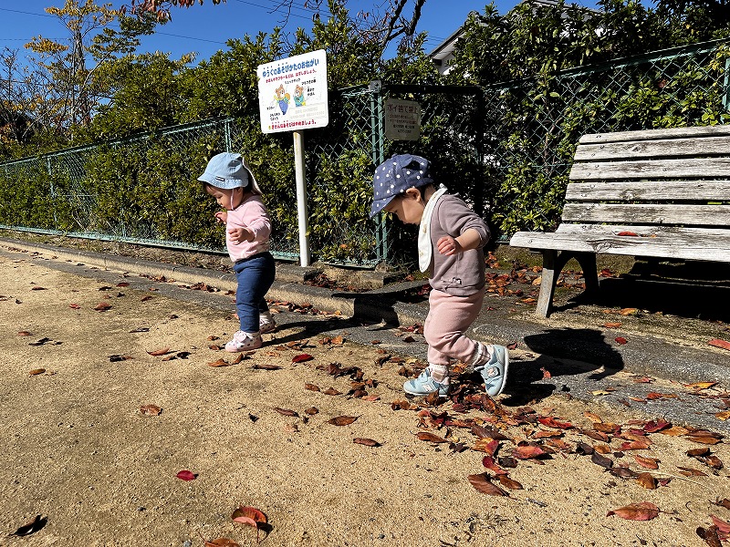 園前の第一公園では、枯れ葉の上を歩くとカサカサ、パリパリと音が鳴ることも楽しいようで、枯れ葉の上を何度も行ったり来たりして、枯れ葉の上を歩く感触や歩くと音が鳴る面白さを味わっていました。