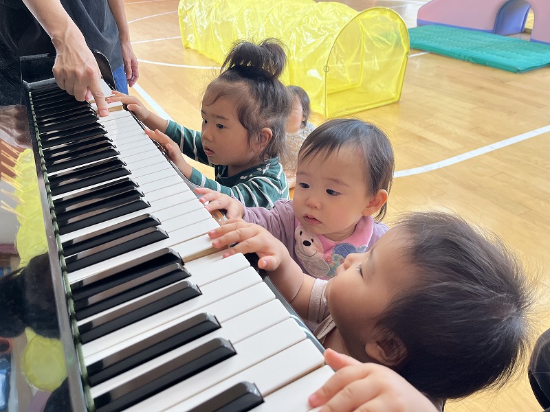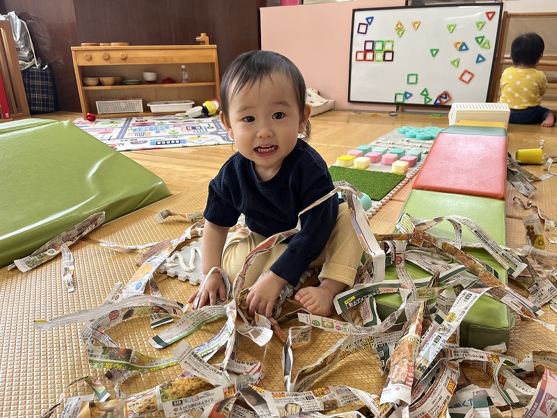 すみれ組の在園児のお友だちは新しいお友だちが来ると興味津々で、自分が持っているおもちゃを「どうぞ」と持って来てくれたり、お母さんと離れて不安になって泣いている子がいると、“どうしたの?”と話しかけているように顔を覗き込みに来る姿が見られます。