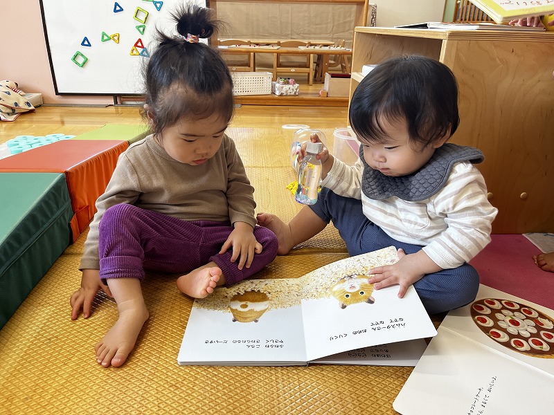 新人のお友だちも少しずつこども園に慣れてきて、好きなあそびを見つけてじっくり楽しんだり、お友だちがしている事にも興味が出てきて一緒に絵本を見たり、ポットン落としやマグフォーマー、ままごとやブロックをしたりと、保育者が仲立ちとなりながら、お友だちとのやりとりを楽しんでいます。