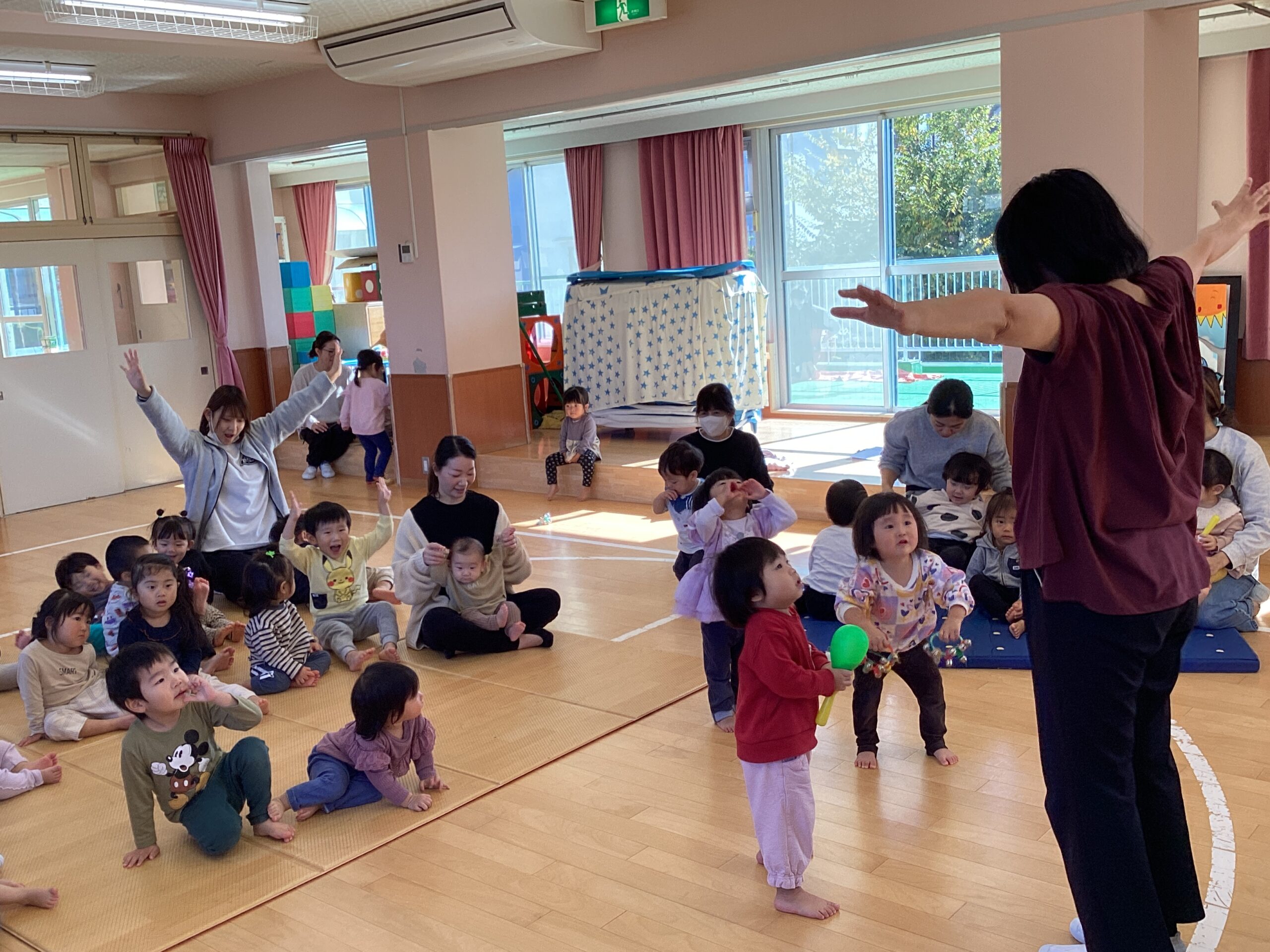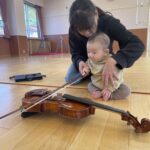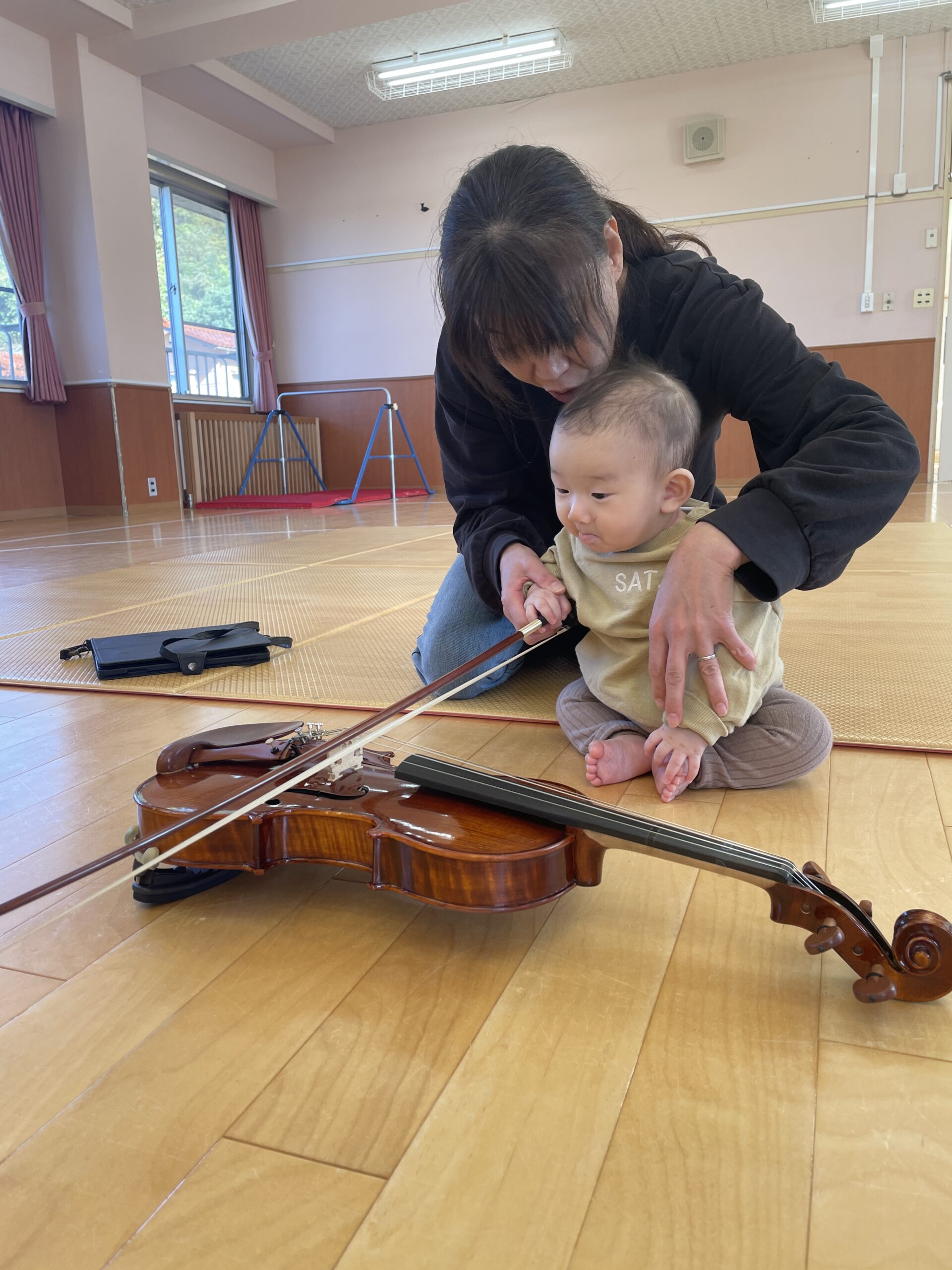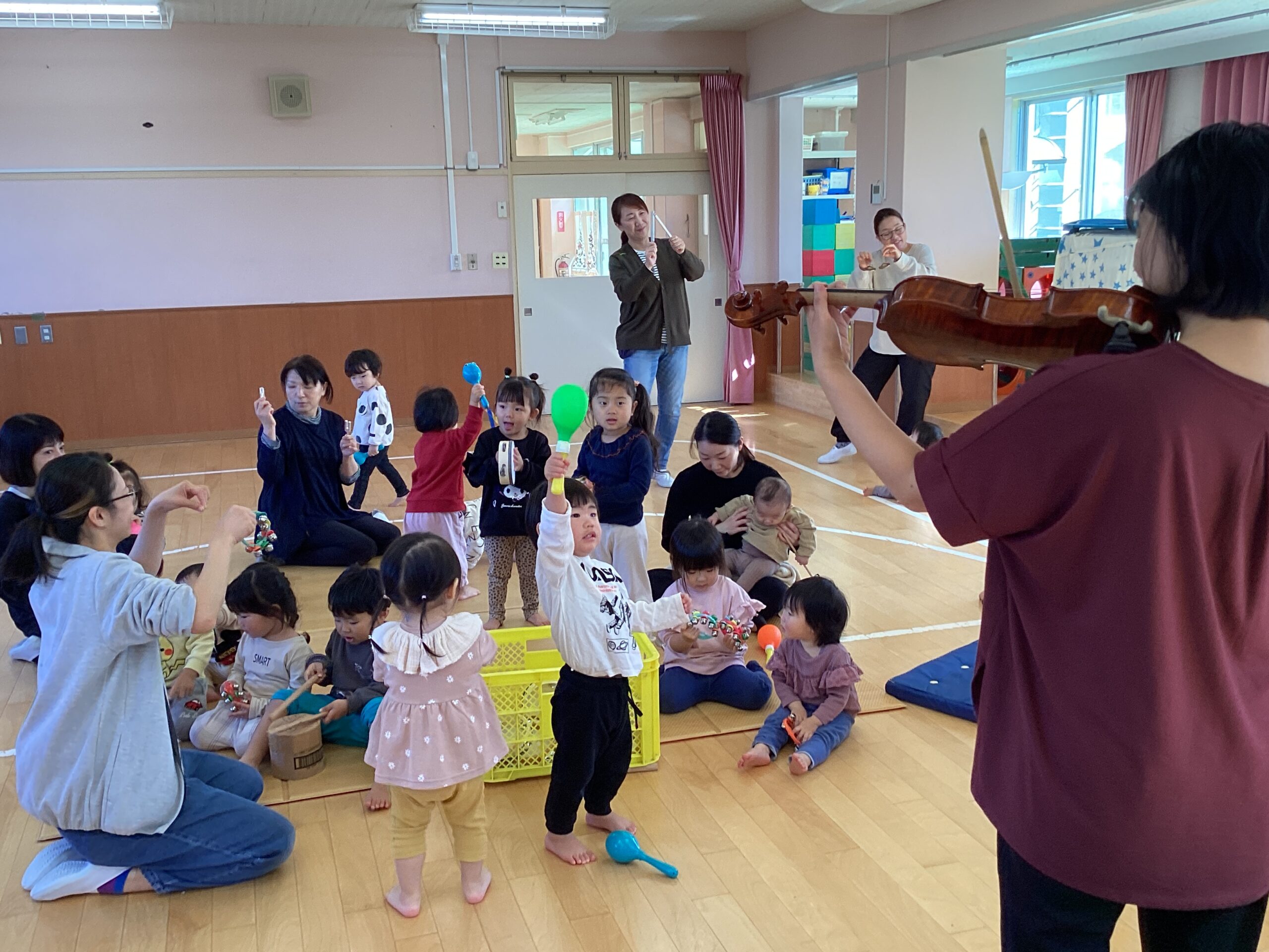 また、「どんぐりころころ」や「やまのおんがくか」「きらきらぼし」などの曲に合わせての楽器遊びでは、素敵なヴァイオリンの伴奏の音色に心癒されながら、笑顔で楽器を鳴らして楽しんでいました!