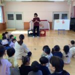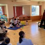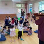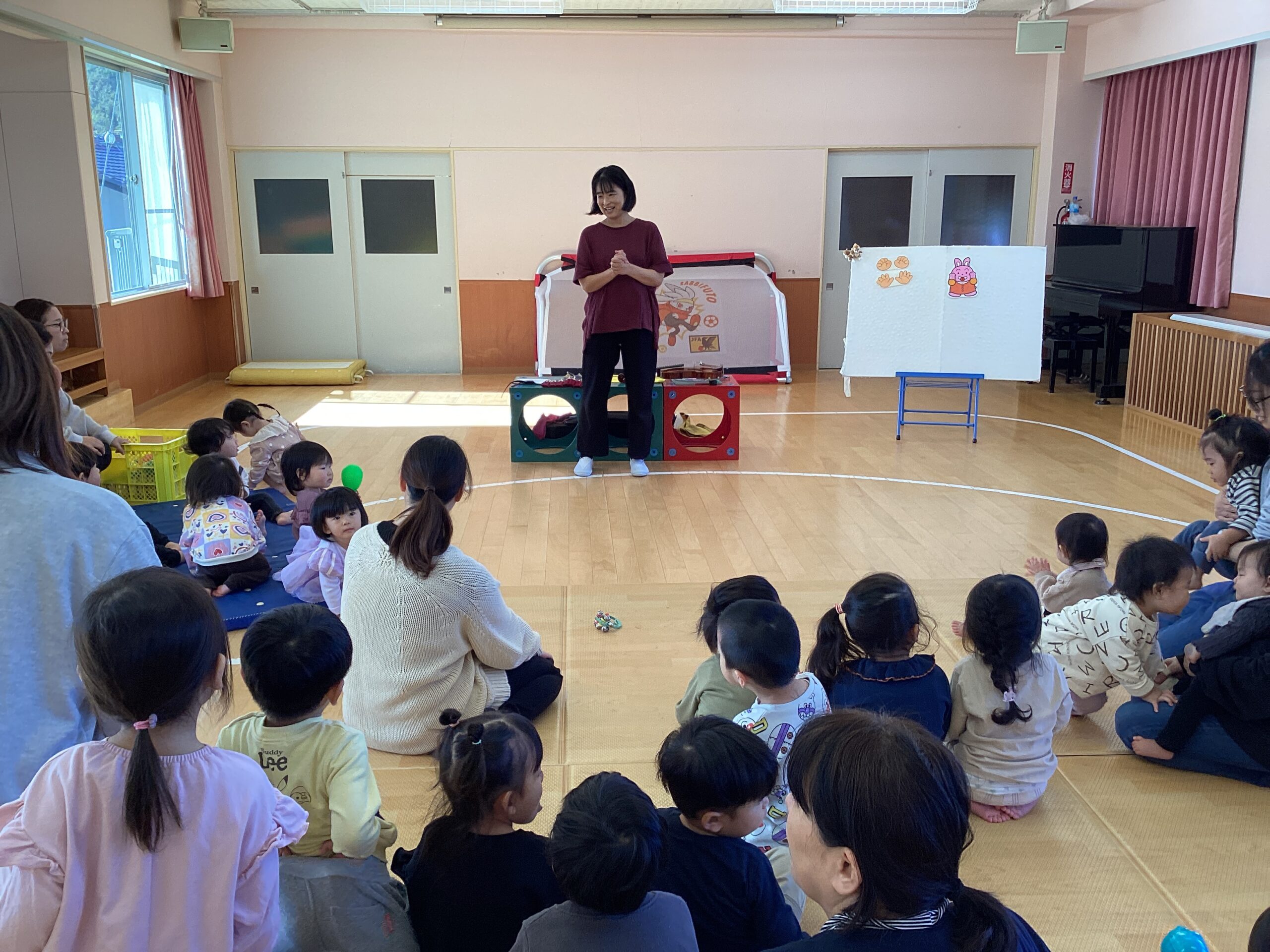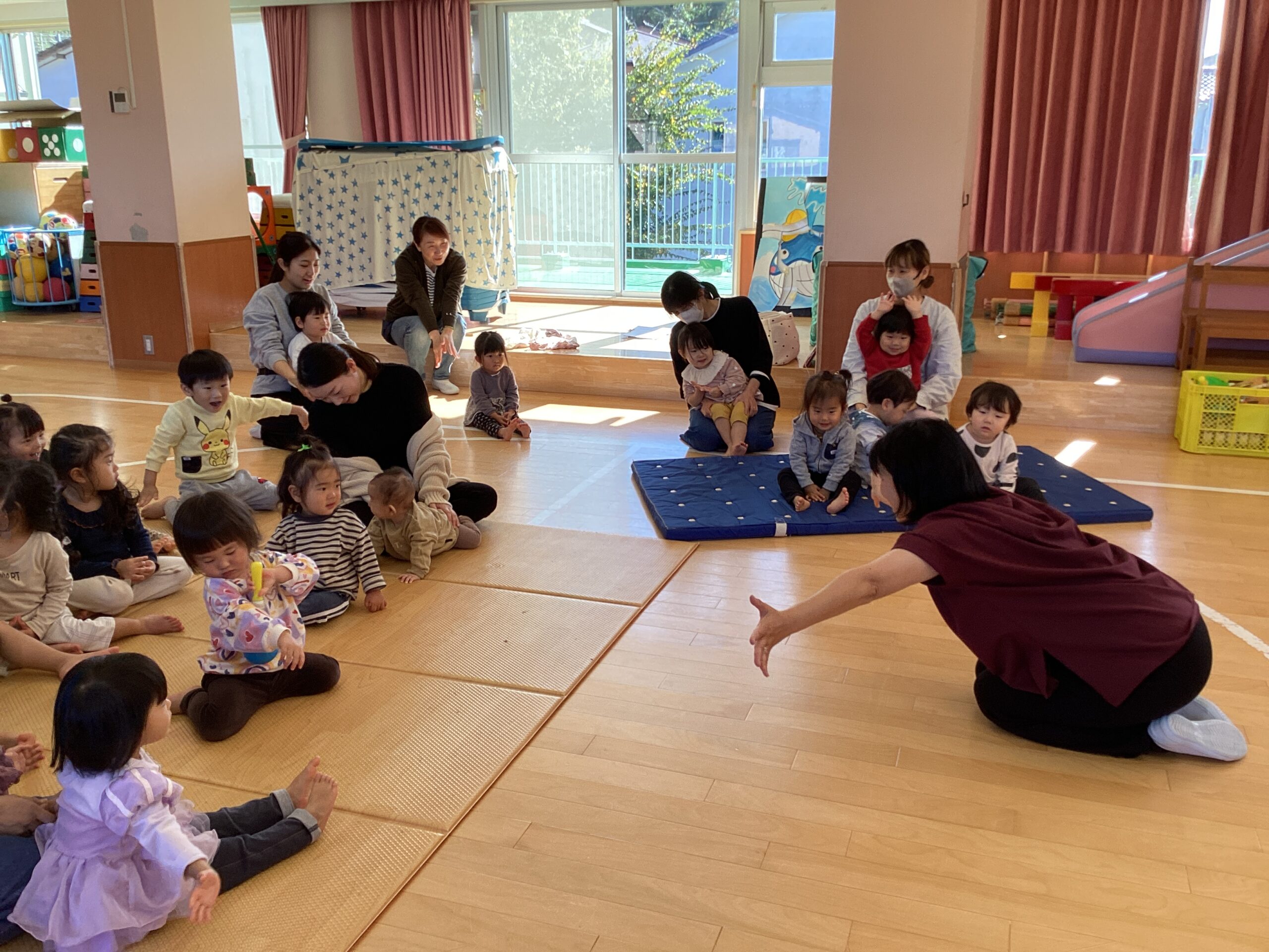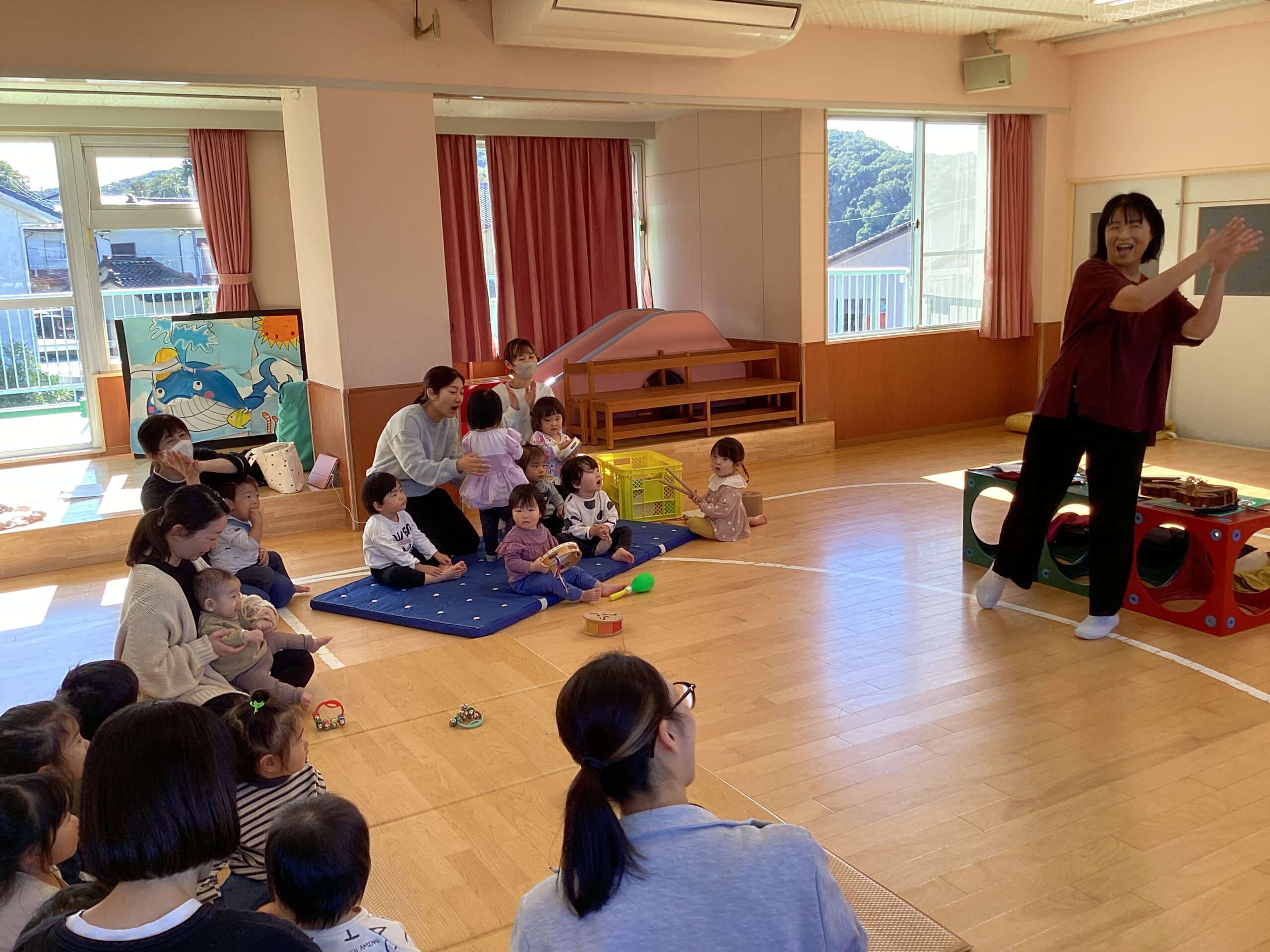また、「どんぐりころころ」や「やまのおんがくか」「きらきらぼし」などの曲に合わせての楽器遊びでは、素敵なヴァイオリンの伴奏の音色に心癒されながら、笑顔で楽器を鳴らして楽しんでいました!
