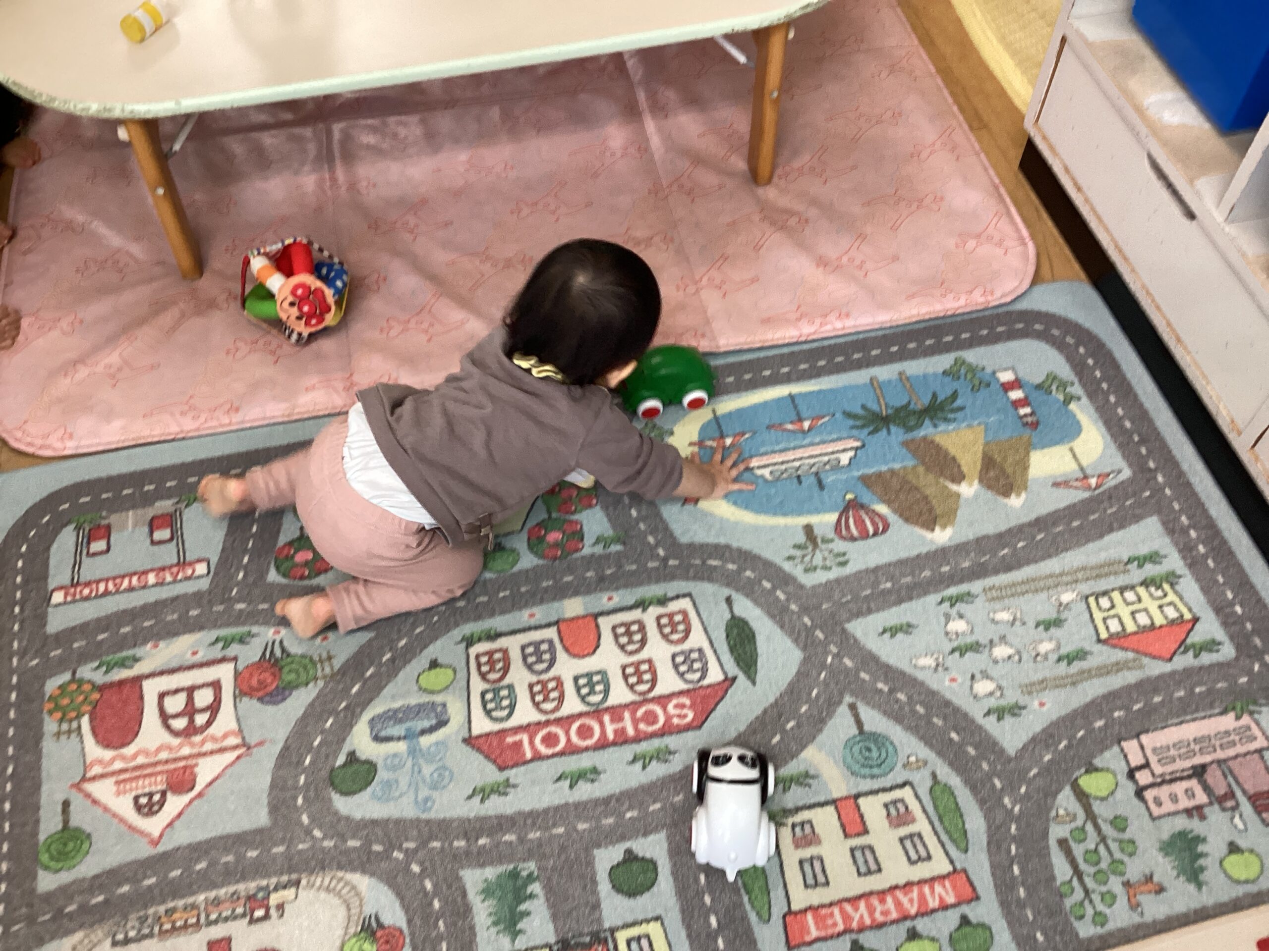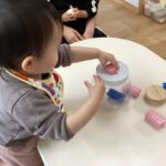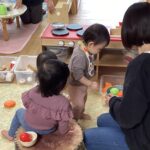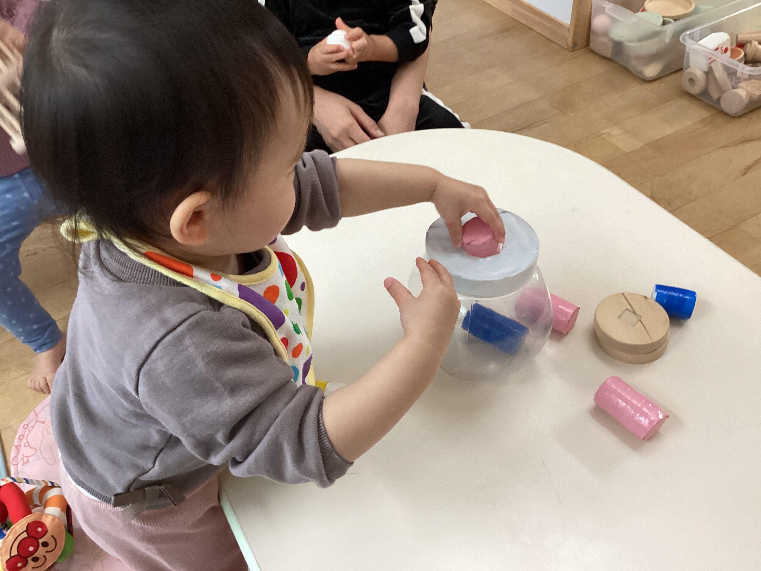 気に入ったおもちゃを見つけると手に取ってお母さんや保育者の所に持ってきて、一緒にポットン落としや車のおもちゃを走らせて遊んだり、