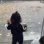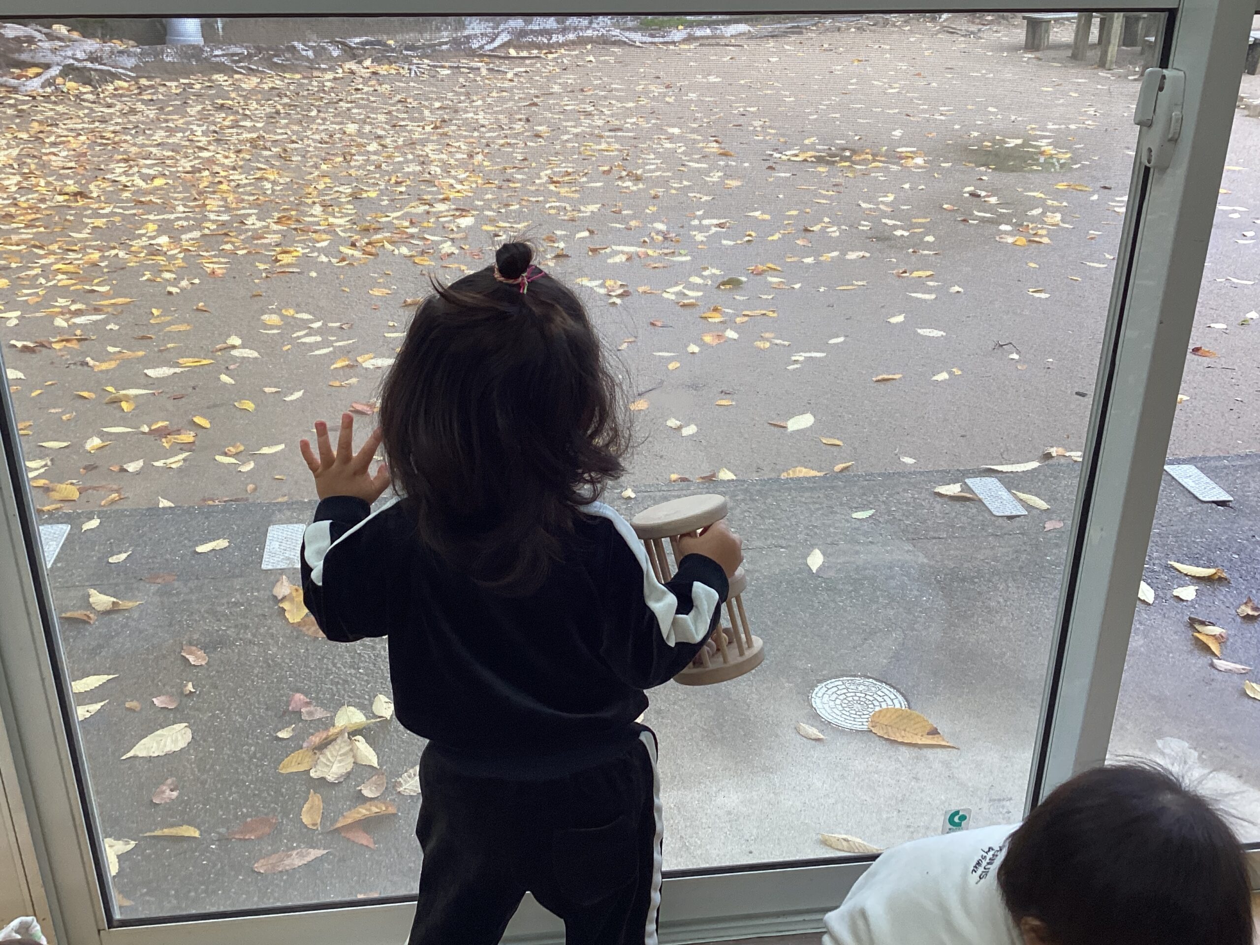 お部屋の中から園庭を眺めていると、木から落ちてくる葉っぱを見て興味津々!次々に落ちてくる色とりどりの落ち葉にくぎづけでした!!