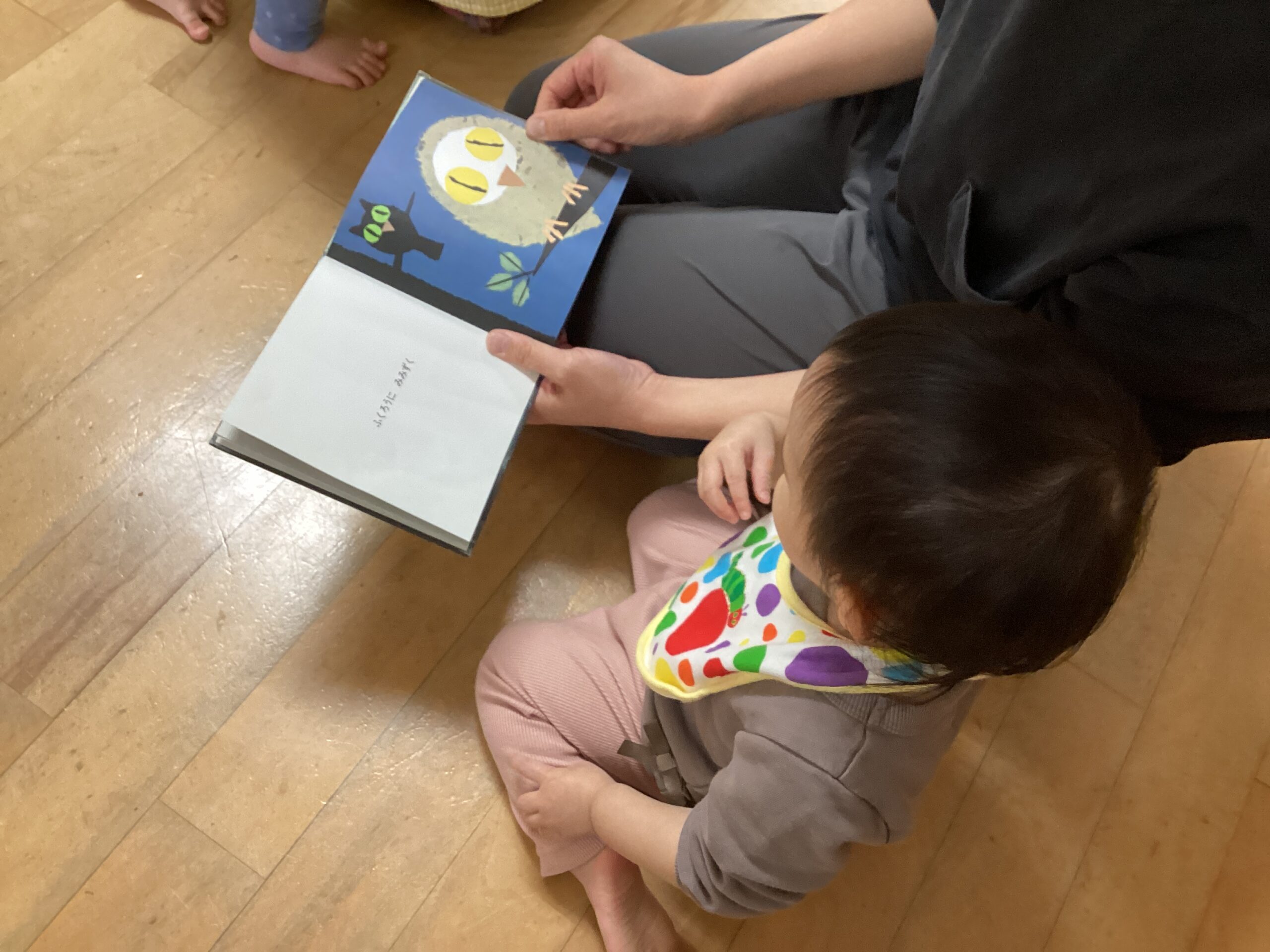 絵本コーナーでもお母さんや保育者に絵本を読んでもらうと、出てくるキャラクターを指さしながらじっくりと絵本を楽しんでいました!