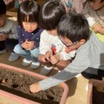 チューリップの球根を植えました。みんなが一つお兄さん、お姉さんのひまわり組さんになったら花が咲くことを伝えると、毎日のようにプランターをながめて「まだ芽出んかなー?」と観察しています。来年きれいなチューリップが咲くのが楽しみです。