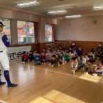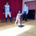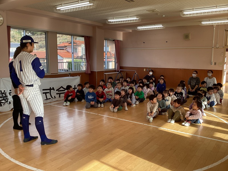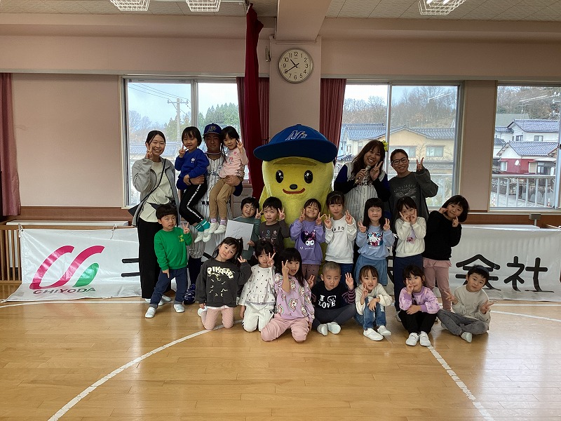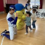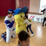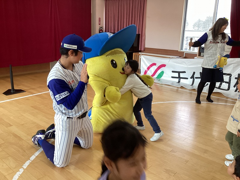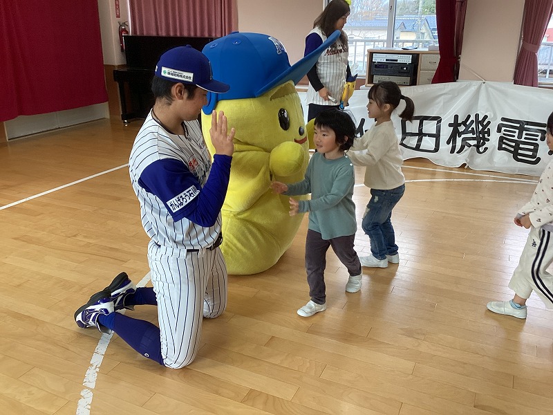 石川ミリオンスターズから、三谷選手とマスコットキャラクターのスタ坊が遊びに来てくれました。