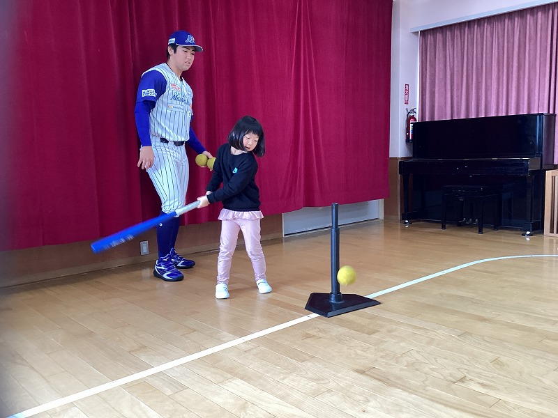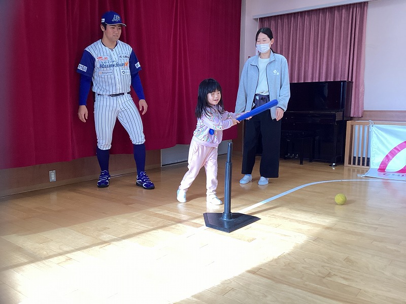 バットの持ち方を教えてもらい、実際にボールを打つ体験もしました。
