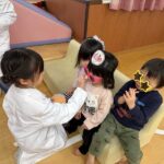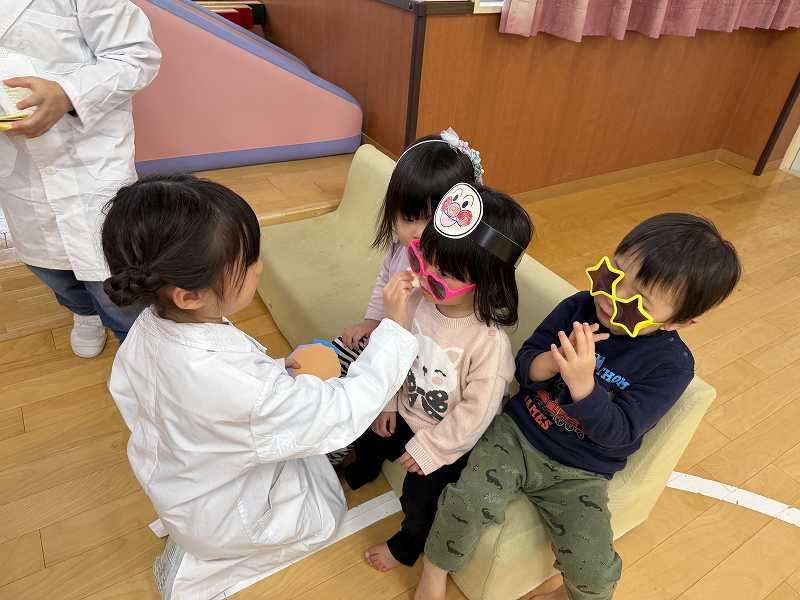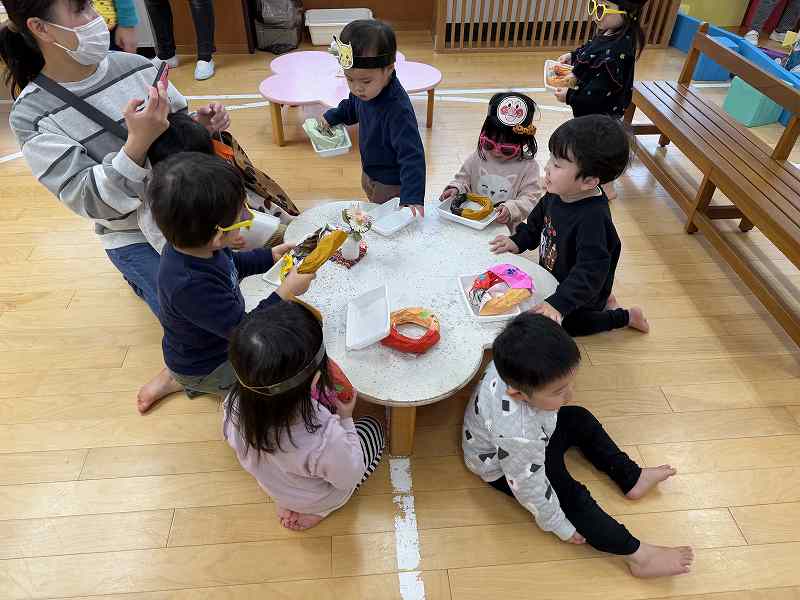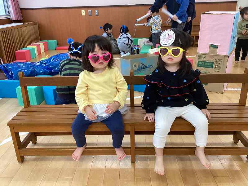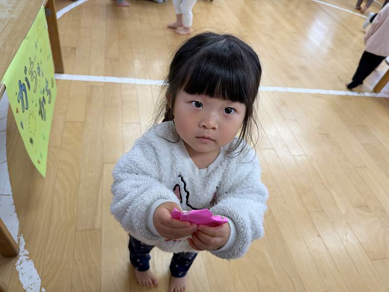 お店屋さんになりきったばら組のお兄ちゃん達が「こっちでお魚釣ろう!」と手を引いてくれたり、「可愛くしてあげる」と言ってカチューシャやサングラス、ままごとでお化粧までしてくれたりと大盛り上がりでとっても楽しそうでした。お土産に腕時計やハートの折り紙をもらい、お部屋に戻ってからも何度もそのお土産を眺め余韻を楽しむ子どもたちでした。