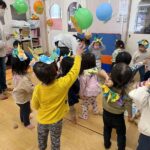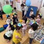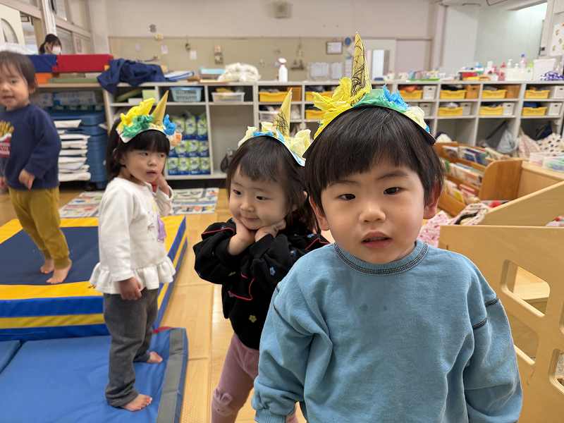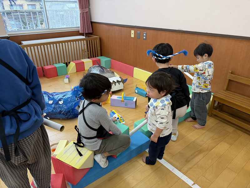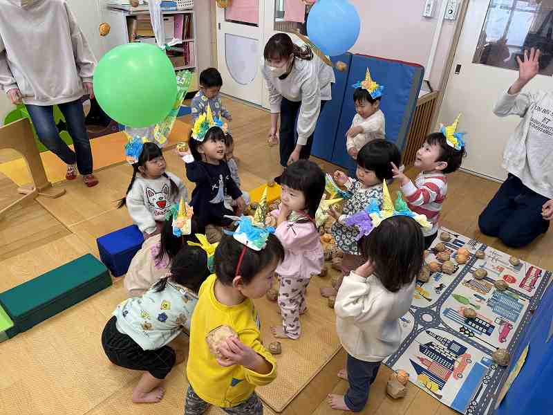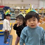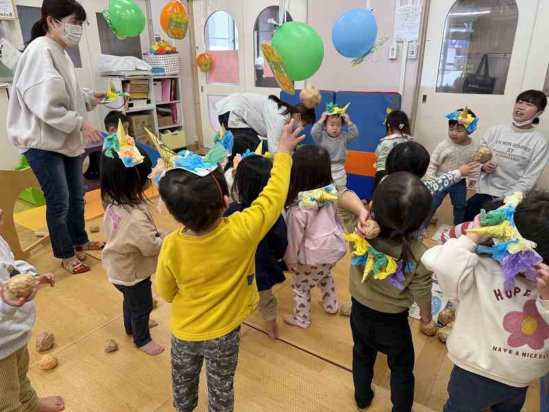 節分の日にみんなでお腹の中にいる鬼を退治しました!「おなかのなかにおにがいる」という絵本を読み、みんなのお腹の中にはどんな鬼がいるかな?とお話をしました。中には自分のお腹を見て鬼がいないか確認する子もいて微笑ましかったです(*^-^*) 事前に作った鬼のカチューシャを付け、天井に吊るされた風船の鬼に向かって元気いっぱいボールを投げ、悪い鬼を退治することができました☺