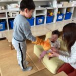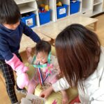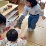 年長組の子どもたちが「なんさいになったん?」と質問したり、「かわいい!」と優しく話しかけたりしながら仲良く遊ぶ姿も見られました。