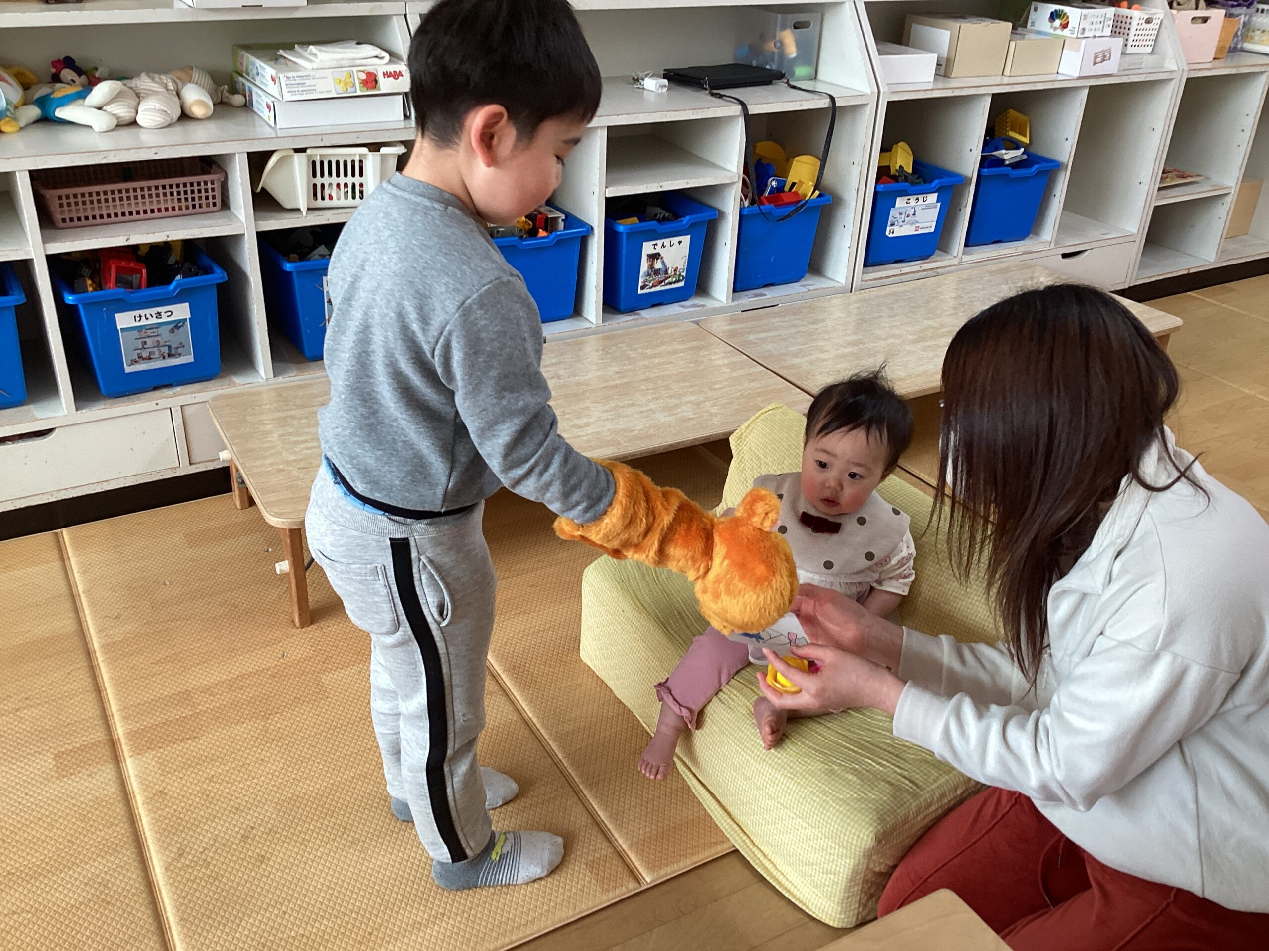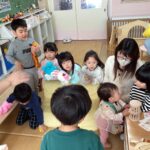 園の年長組の子どもたちがサプライズ登場し、遊びに来てくれた3月生まれのお友だちにパペット人形を使った人形劇を披露してお祝いしました。