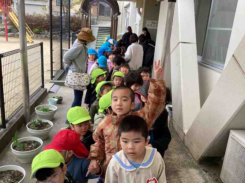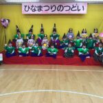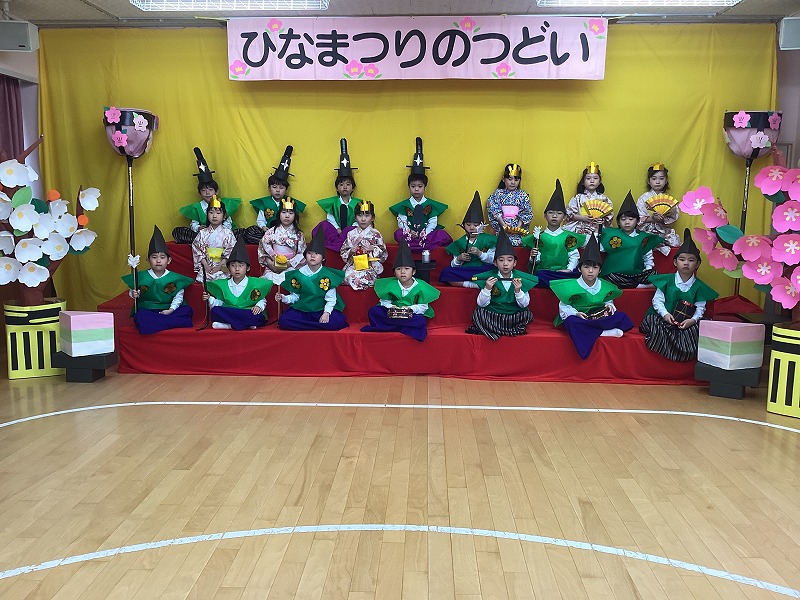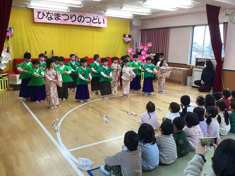 3月3日はひなまつり会。着物に着替えて段の上に座りおすまし顔の子ども達。凛々しい表情が見られました。ひなまつりの踊りや歌を披露したり、保護者の方に今まで園で描いてきた思い出の絵を一冊にまとめプレゼントしました。たくさんの保護者の方に見てもらえてとても嬉しそうな子ども達でした。